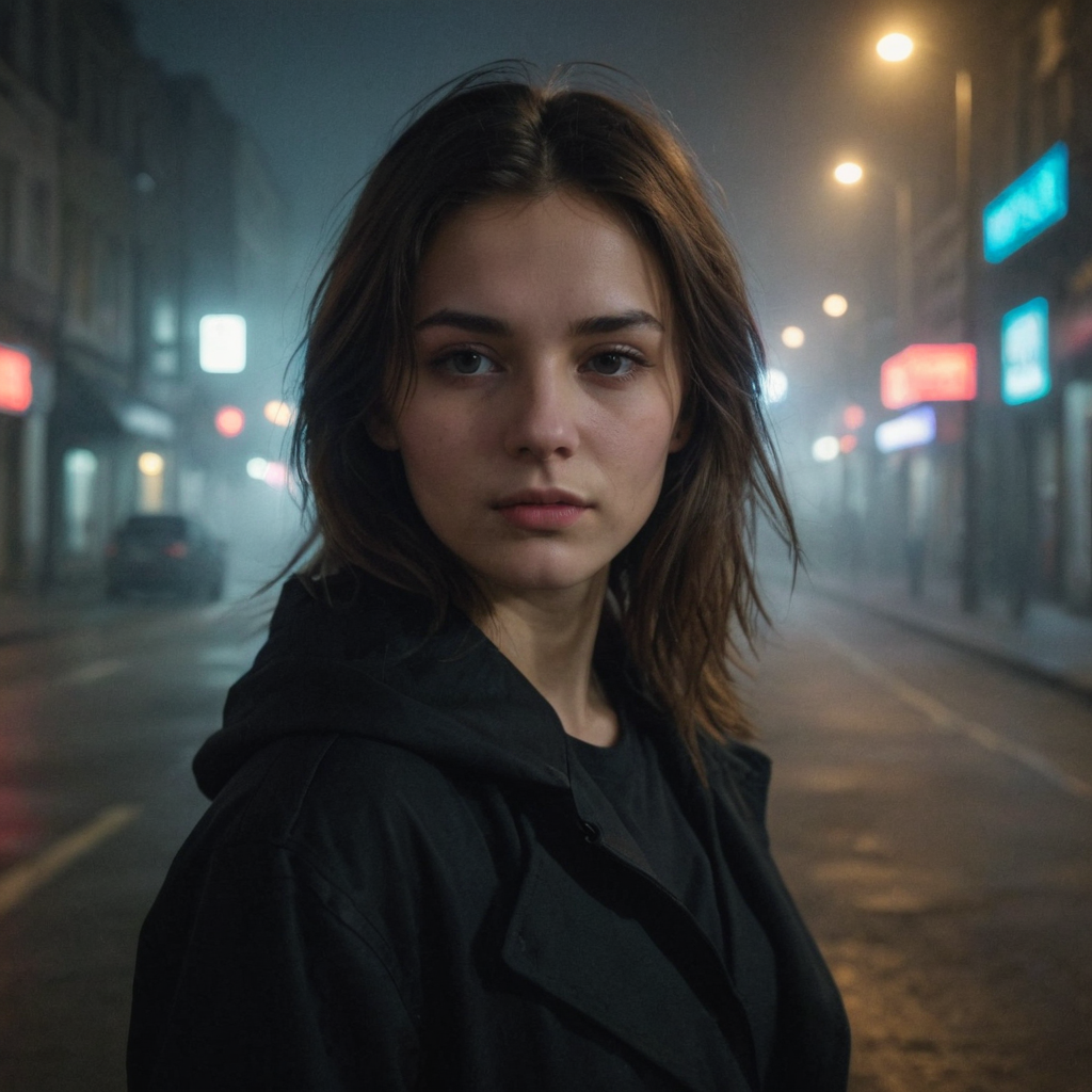 city street, neon, fog, volumetric, closeup portrait photo of young woman in dark clothes