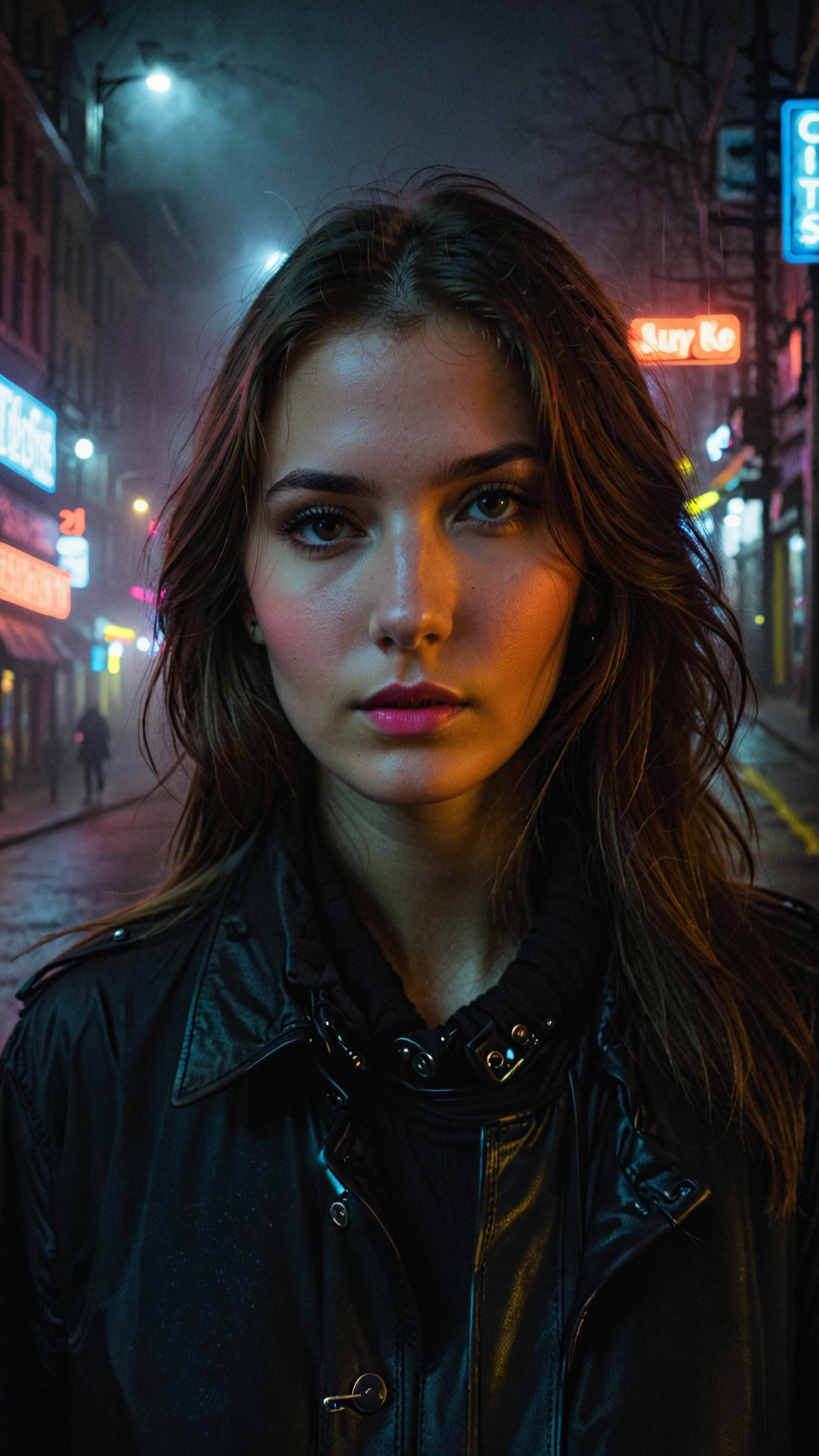 city street, neon, fog, volumetric, closeup portrait photo of young woman in dark clothes