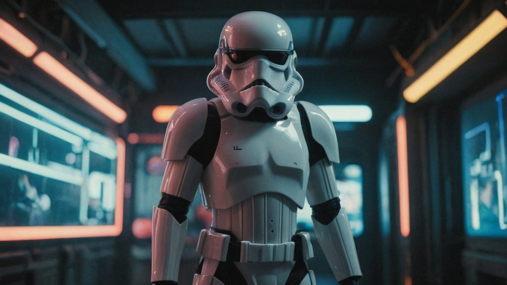 cinematic film still, Storm Trooper, colored lights, amazing quality, wallpaper, analog film grain <lora:aesthetic_anime_v1s:0.5> <lora:add-detail-xl:1.1>