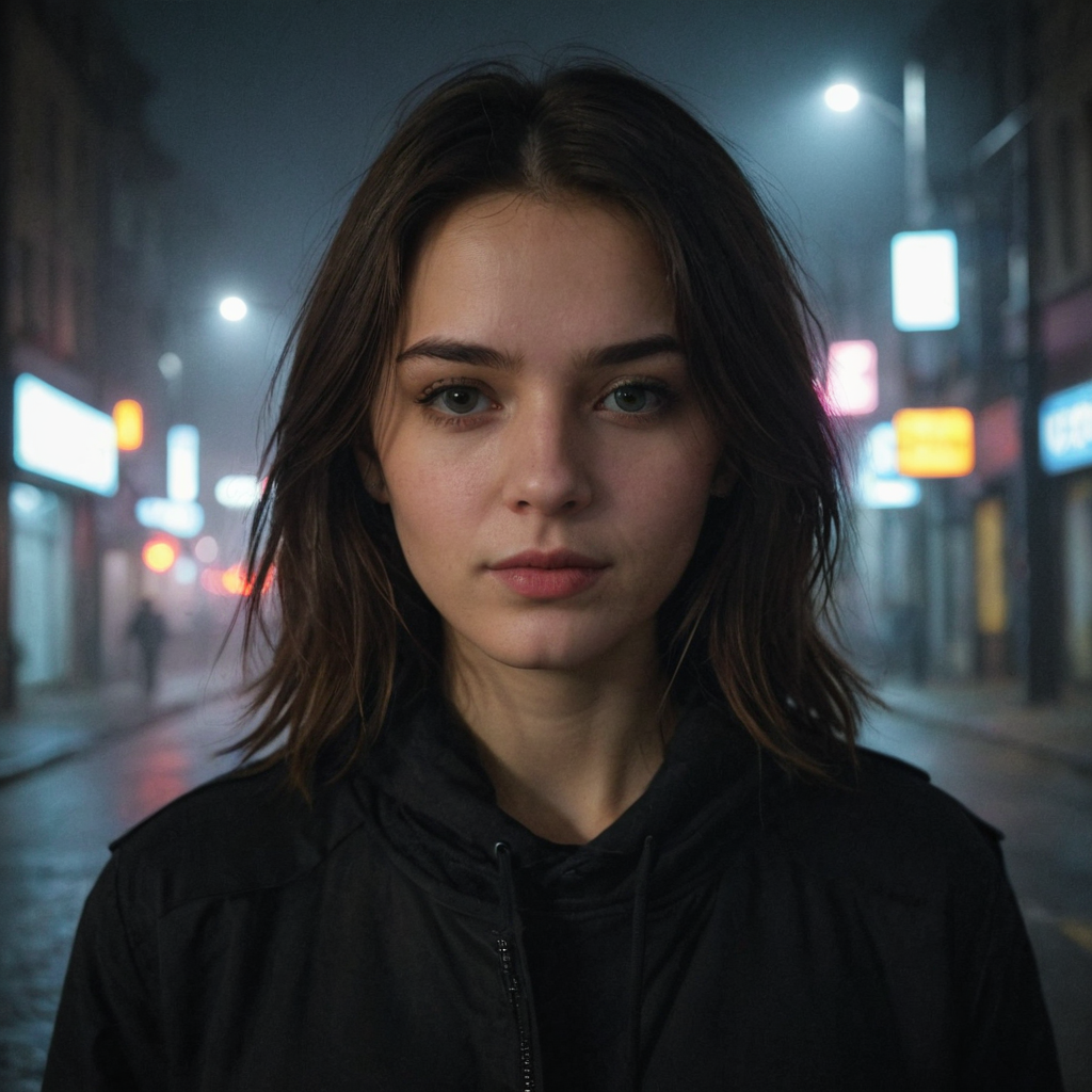 city street, neon, fog, volumetric, closeup portrait photo of young woman in dark clothes