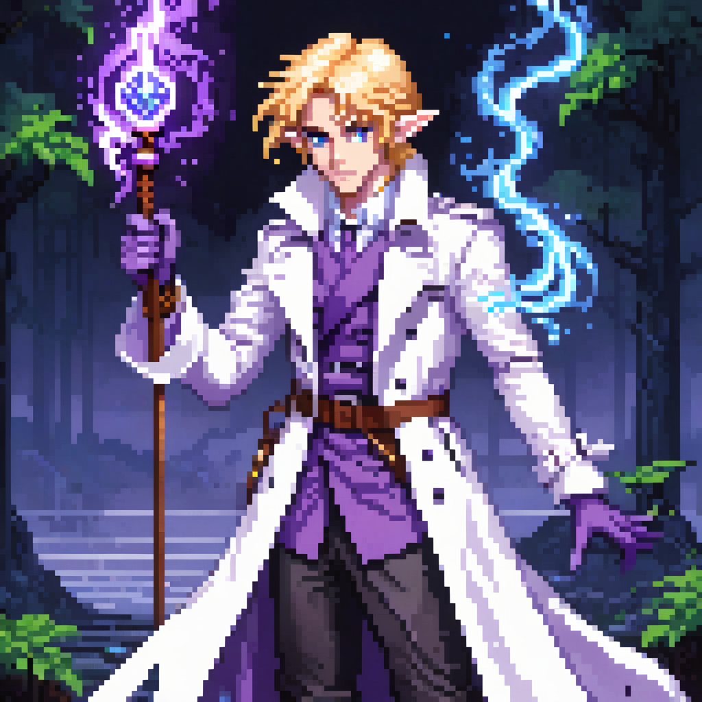 (apocalyptic fantasy), (pixel art), detailed, torso, gloves, longer magic staff (no magic on the staff), action pose, white trench coat, nature background, surreal, strange, (full body magic caster elf with blonde hair wearing a fantasy white trench coat, holding a detailed magic staff, covered in hazy transparent purple magic, photo), apocalyptic theme, man, portrait, closed mouth, neutral expression, bored expression (upper body, looking away:1.1), straight short hair