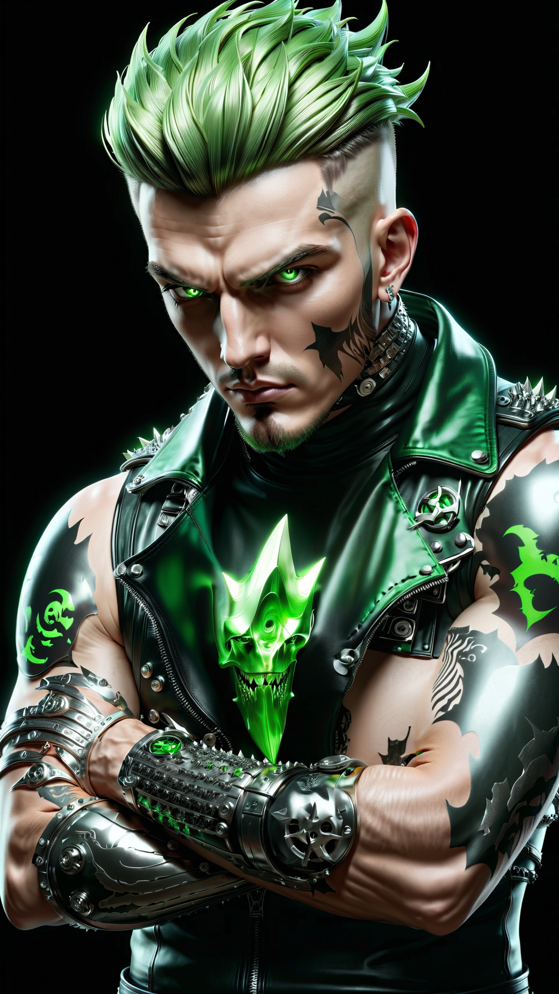Supervillain with the ability of exuding toxic green radioactive vapor. He gives off a bright green glow/aura. Masculine man, Caucasian male. Heavy Metal and Punk Rock fan. Tall, thin, lithe but muscular, sinewy, well defined, wide shouldered. Pale skin, strong brow and chin. Rugged good looks. Electric green eyes, intense gaze, often sneering. Bright green hair, shaved on the sides and top, with a shark fin Mohawk hairstyle in the center of his head. 3 spiked piercings down the center of his forehead. Goatee on the face is also green. He wears a sleeveless black leather motorcycle jacket, unzipped. Black leather bracers on his arms, silver spikes on them (bracers). Red biohazard tattoo on his left arm. Armpit hair is also green, which he displays proudly. Black leather jeans, with a spiked leather belt. A silver biohazard symbol as the belt buckle. Full body pose. His aura is a radioactive green, often toxic to the people around him. He roams the city streets.