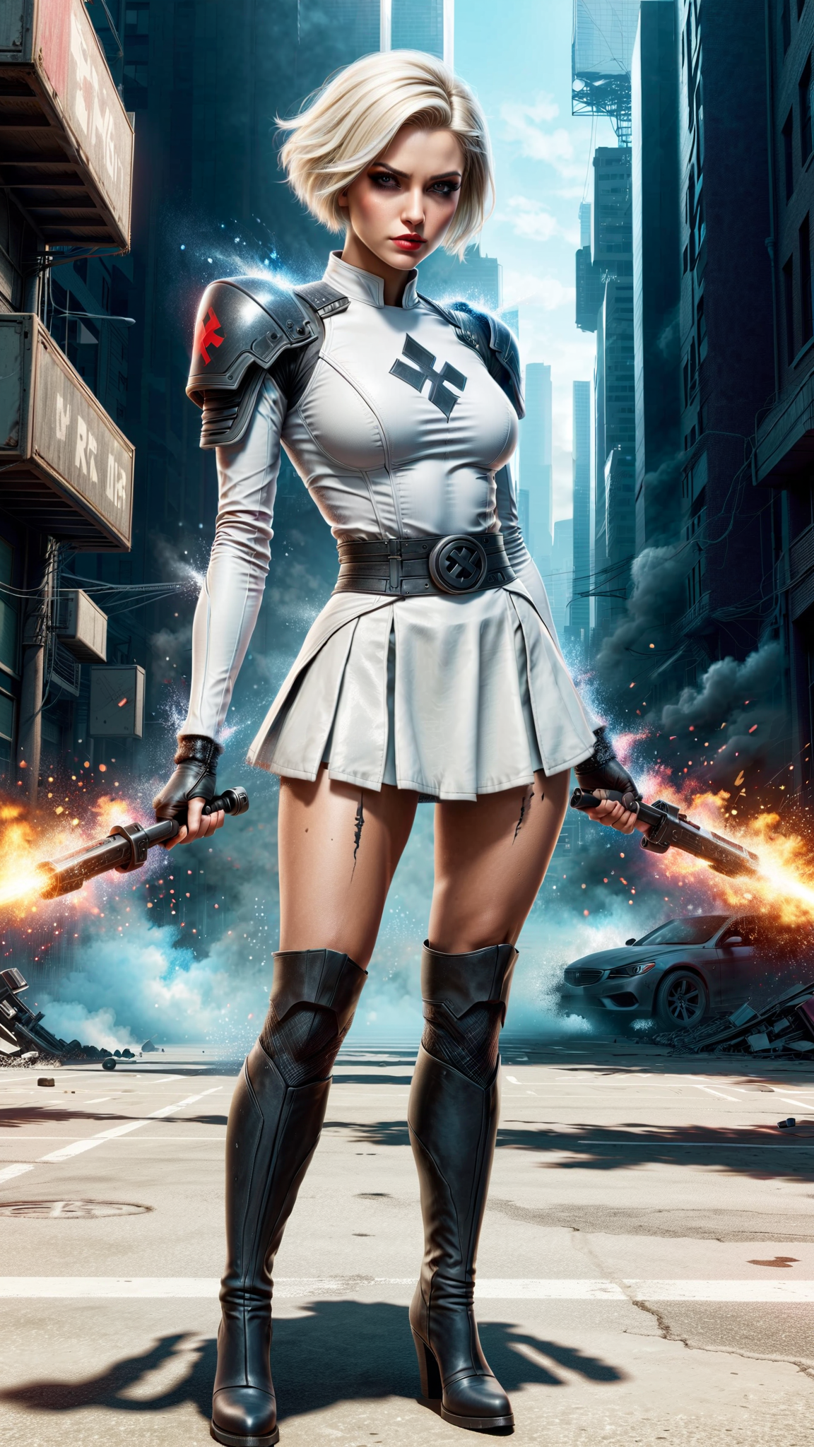 Sci-Fi dystopian world. Supervillain; she is their secret weapon and enemy to humanity, a member of the Neo-Nazi party. Genetically engineered to be a soldier and a telepath, she can read minds, attack minds, mind control, and influence peoples worst behavior, especially hate. She can draw large crowds and whip them into a fervor. She is also a fighter, and carries electrically charged throwing throwing stars shaped like swastikas. They explode when they hit their target. Caucasian female of German descent, Nordic good looks. Tall, slim but shapely, athletic, strong, fortitude. Pale blonde hair, pixie hairstyle cut very short on the sides and back, longer on top and flipped over one eye. (((Short hair))) Icy blue eyes with long lashes, intense stare looking into your mind. High cheekbones and full lips, very modelesque, dark red lipstick. She hardly ever smiles--- when she does, it's for all the wrong reasons. Her uniform is a white long sleeved spandex shirt with red stripes down the outside sleeves sides of the torso. There is a big red swastika on the front of the shirt-- she displays it proudly, unashamed. Black leather bracers on her arms, black shoulder pads, and black leather belt that meets in a V-shape at her waist. A form-fitting mid-thigh white skirt with red stripes down the sides. Sheer white leggings on shapely legs, and knee-high shiny black leather boots, high heeled but sturdy. She usually wears a shiny gold swastika pin somewhere on her person...she is unashamed. Full body pose, sending out brain waves to all that will hear.....