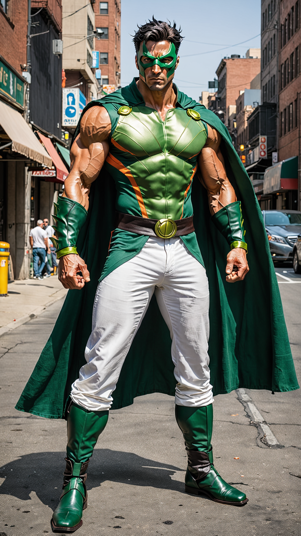 (((Masterpiece))) Super-hero, martial artist, street fighter. He absorbs sunlight and uses it to power his hits and strikes-- his hands glow with power. It also gives him some invulnerability. He keeps a praying mantis as a mascot. Hypermasculine male superhero, Caucasian male of European descent (((white male))), martial artist. White male, short black hair fade style. strong jaw and brow, chiseled squared jaw, soul patch on face. Dark brown eyes, intense gaze. Jade green soft cloth super-hero mask covering top of head and eyes, tied in back his head. Mask covers eyes and top of head, leaving the mouth and jaw area open. Muscular, sinewy, athletic, strong. Loose fitting outfit, solid dark green with bright orange trim on the sides of the top, stripes down the sides of the pants. Form fitting top, deep plunging neckline and open on the sides, exposing his arms and sides. Yin-Yang symbol on outfit. Bare arms, shirt open. Baggy pants, bottoms stuffed into boots. Long orange sash around the waist, jade green ninja boots. Can harness solar power, light strikes on impact. Full body pose, fighting action. Praying Mantis as a friend and mascot.
