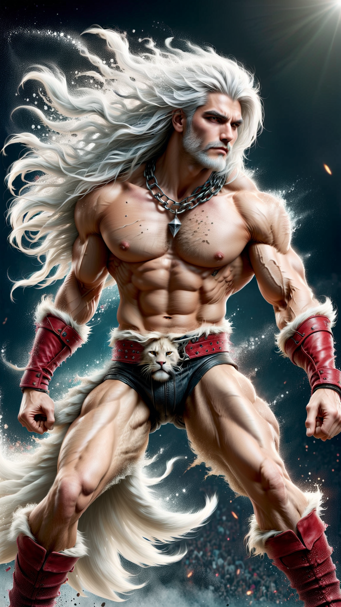Heavy Metal, Hard Rock, Sci-Fi, superhero. A (((human))) rock star from another world with lion-like eyes, a long white lion's tail, and wild white hair. Caucasian male, human man, young man. He is really tall and strong,, and he roars loud enough to be heard blocks away. He runs at high speed, can jump really high, and has sharp claws on the ends on his fingers. Tall, strong, muscular, big muscles, wide back and chest, sinewy, narrow waist, strong powerful legs. His face is a normal human face, but he has yellow lion's eyes. Handsome manly masculine face with strong brow and jaws. A full white Beard and mustache. His hair is a long wild bob, shorter in the sides and back, longer on top, some hair falling over his eyes, and thick white sudeburns. He wears a Scarlet red leather vest, open to reveal his chest. A heavy gold chain around his neck with a Leo zodiac sign pendant. Black leather bands around the tops of his biceps, and black leather bracers around his forearms. Form-fitting white tights with red claw mark designs down the sides of the legs. A heavy studded black leather belt around his waist, and knee-high red leather boots. He is a friend and Ally to all cats, and has a special affinity for wildcsts. Full body pose, probably playing an electric guitar.