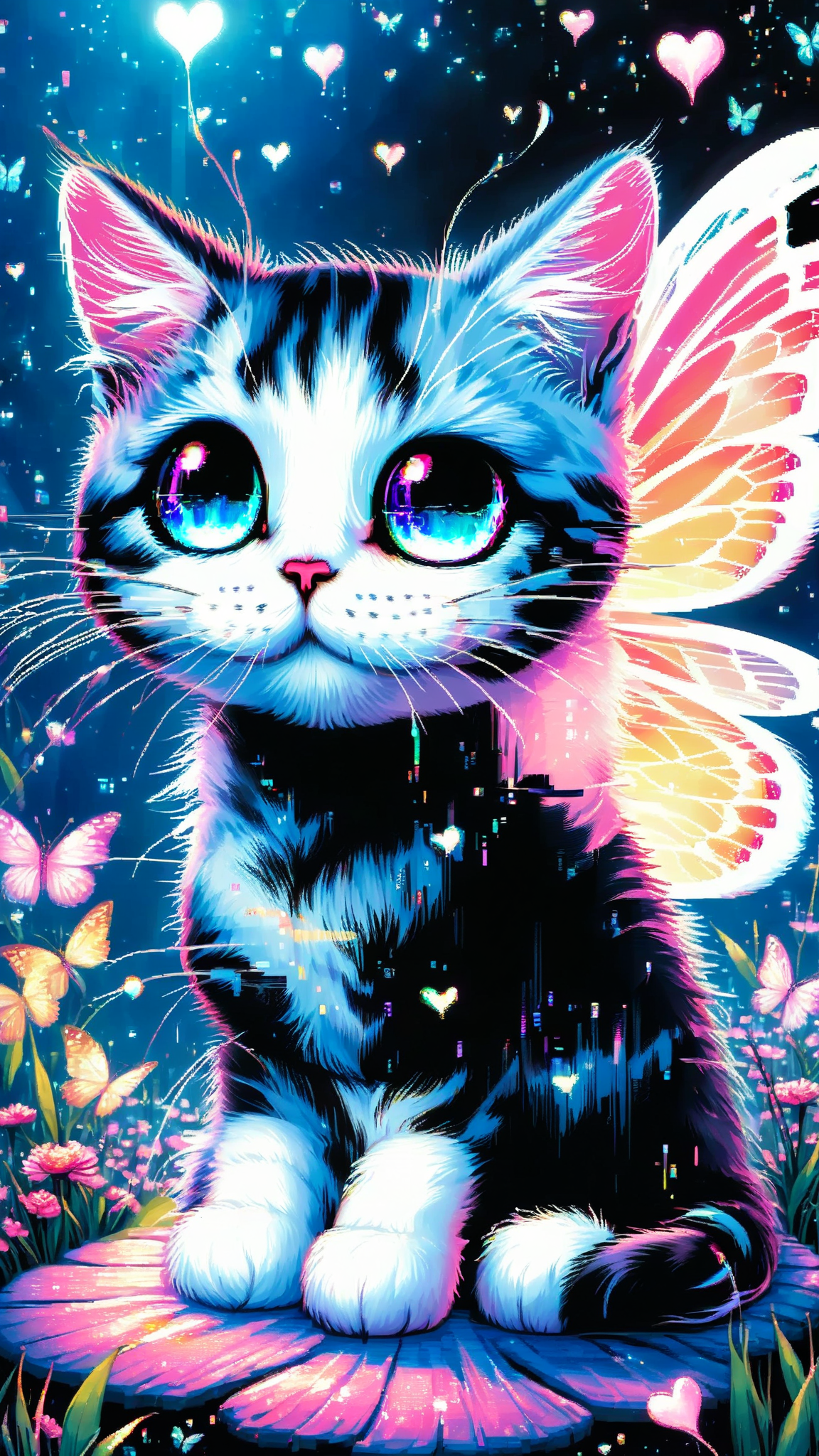 I see faeries. MEOW. She's a cat that walks between Earth and The Faerie Realm. She has powers that no other cat has: she can spit sparks when in danger to protect herself. Her little eyes shine like flashlights in the dark. She can teleport from one place to another in a cloud of glitter. She's telepathic and telekinetic. And most of all....she sees faeries. She plays with the sprites and pixies through sunlit glens and woods. The sprites shine like little stars, and the pixies leave trails of sparkly glitter. They play happily with each other, the cat and her tiny little friends. She's a short haired black cat with a white face and a white tipped tail. Bright happy periwinkle eyes, and a pink heart-shaped nose. When no one is looking, the cat will sometimes sprout a pair of shiny iridescent butterfly wings and go flying with her faerie friends. Full body pose, smiling and playful.