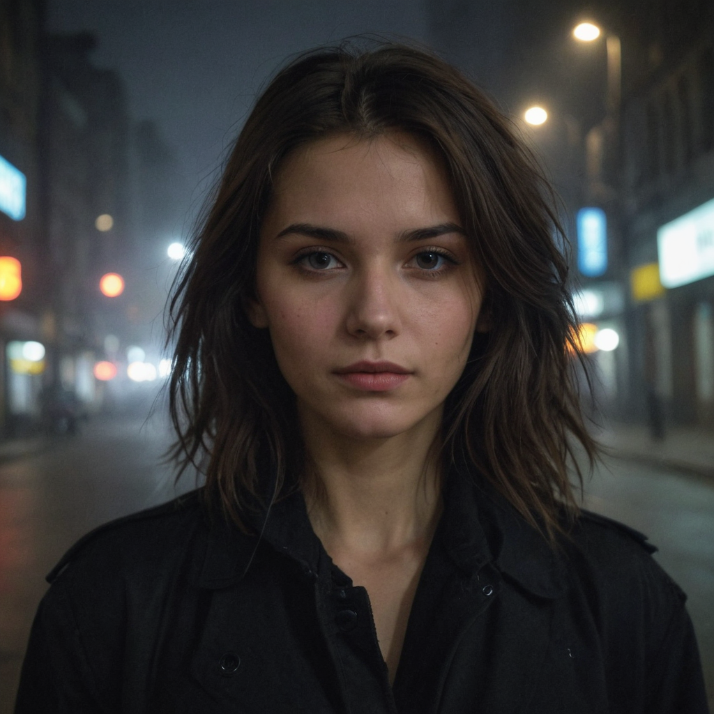 city street, neon, fog, volumetric, closeup portrait photo of young woman in dark clothes