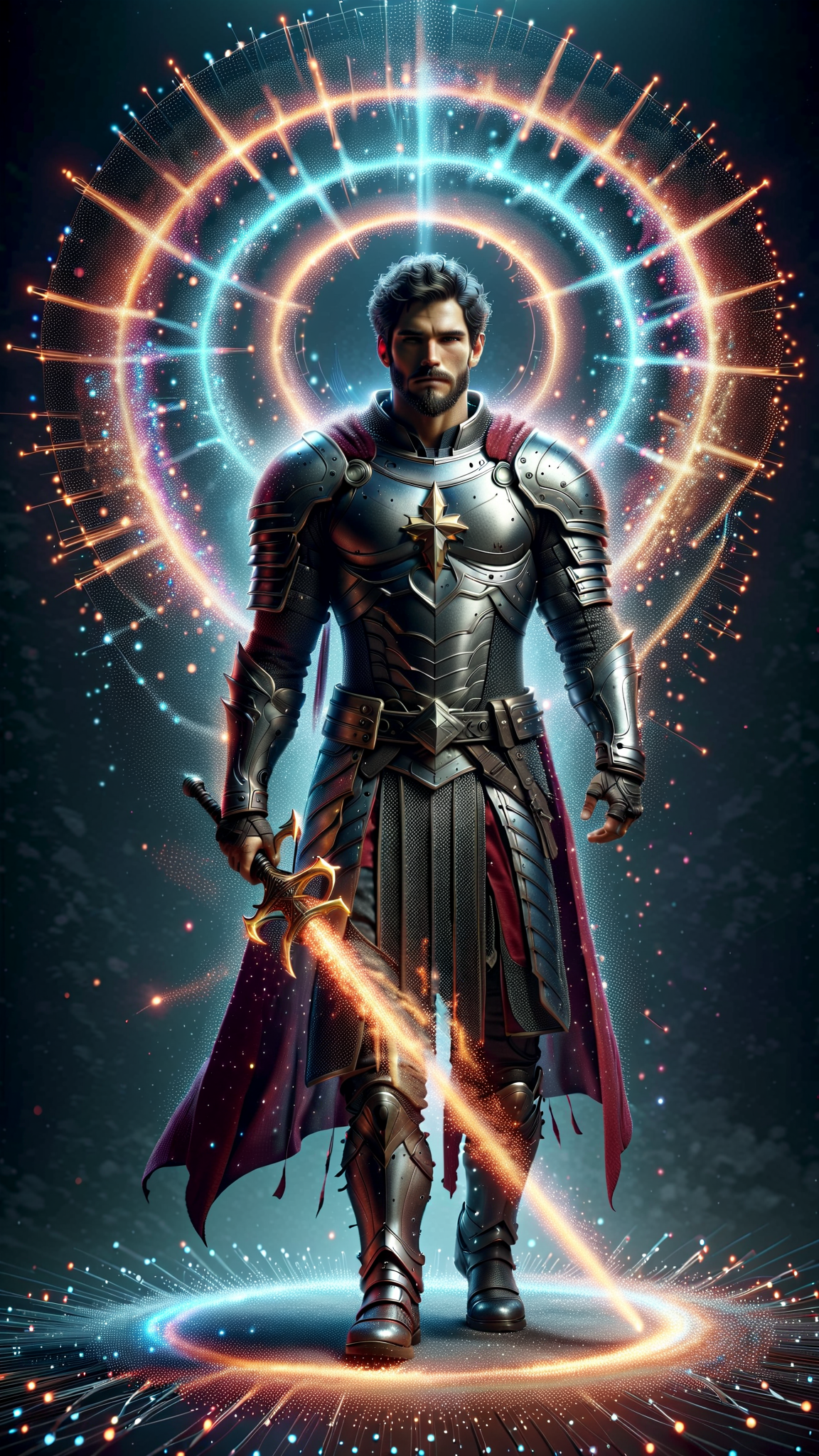 Sci-Fi, Futuristic Super-hero , Christian mystic, modern-day Knight/warrior. He lives in an ultra-futuristic society, but he can see dark forces that most people don't, and he has the power and might to fight against them! He can do everything a wizard does, but it's his faith in God that empowers him. He is invulnerable to most harm, and he carries a long golden glaive with a huge shining white gem. This gem shines with holy light and drives away shadows and demons, or destroy them if needed. It also has a sharp tip that he can use as a weapon like a spear. Tall, strong, muscular, wide shouldered, broad backed, narrow waist, sinewy, hairy chest and legs. Caucasian male of Mediterranean descent, short curly black hair cut extremely short on the sides and back. He wears a thick silver circlet around his head. Strong brow and jaw, intense Hazel eyes. Full well-trimmed beard and mustache. Shiny silver pauldrons on shoulders, shiny silver armor- chestplate and abs, a white diamond Cross on the chestplate, a Star-of-Bethlahem in white crystal embedded within the Cross. He has glowing red glyphs on his armor. He is shirtless under his armor. Scarlet red pants with shiny silver thigh and shin guards on the legs, metallic silver boots to complete the armor. There are red glyphs on the boots. Long Scarlet wizard's cape with thick silver trim around the edges, Christian symbols of protection embedded within the silver trim. His arms are bare, but he does wear silver gloves with shiny red bracers on his arms. Full body pose, arm with glaive raised in defiance, hair under his arm visible and thick.