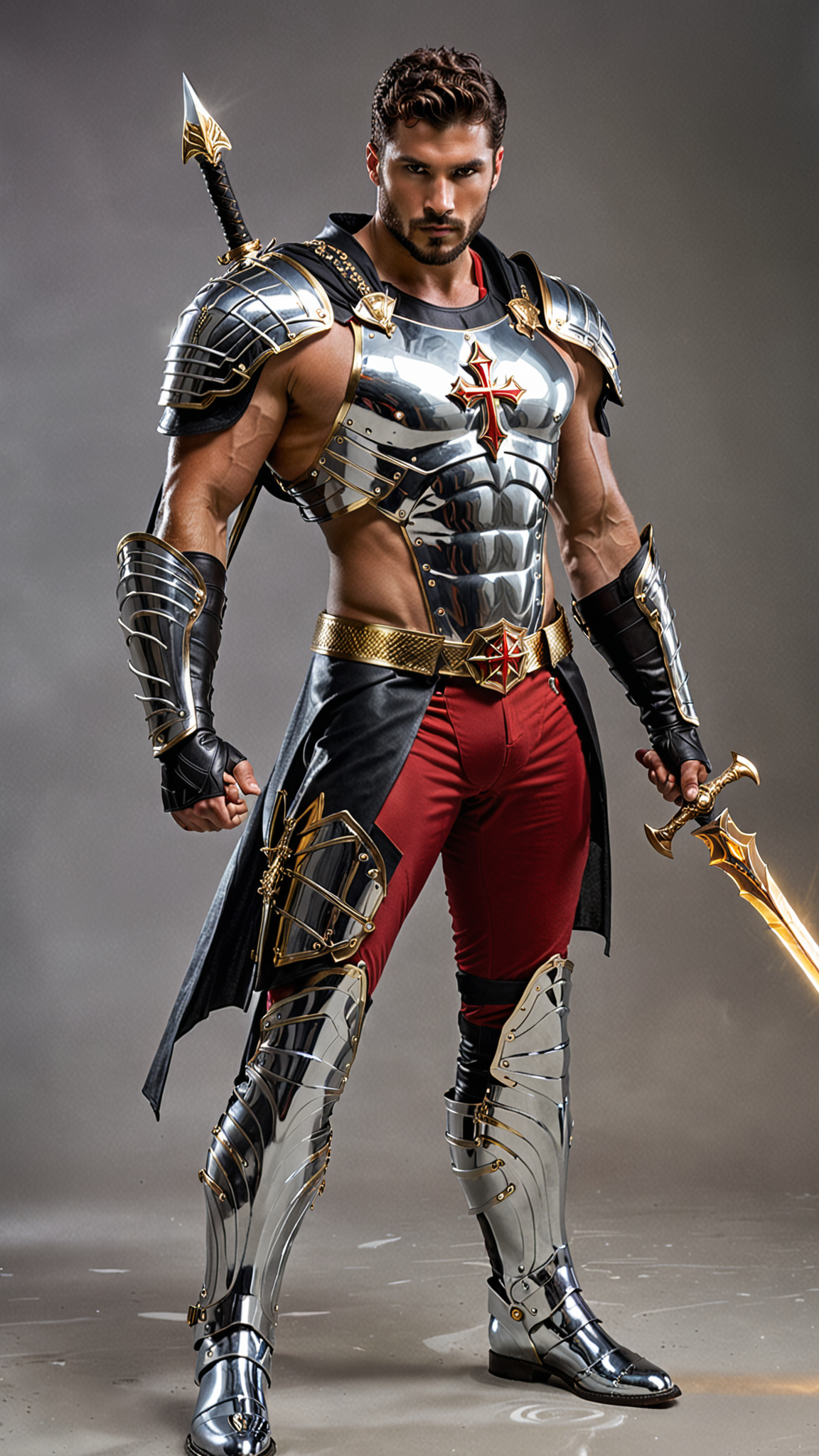 Sci-Fi, Futuristic Super-hero , Christian mystic, modern-day warrior. He lives in an ultra-futuristic society, but he can see dark forces that most people don't. He is invulnerable to most harm, and he carries a long golden glaive with a huge shining white gem. This gem shines with holy light and drives away shadows and demons, or destroy them if needed. It also has a sharp tip that he can use as a weapon like a spear. The arm holding the glaive is raised in defiance, the hair in his armpit is visible and thick. Tall, strong, muscular, wide shouldered, broad backed, narrow waist, sinewy, hairy chest and legs. Caucasian male of Mediterranean descent, short curly black hair cut extremely short on the sides and back. He wears a thick chrome circlet around his head. Strong brow and jaw, intense Hazel eyes. Full well-trimmed beard and mustache. Shiny chrome pauldrons on shoulders, transparent glass armor- chestplate and abs, a white diamond Cross on the chestplate. He has glowing gold glyphs on his armor. He is shirtless under his armor, so you can see his hairy chest. Scarlet red pants with shiny glass thigh and shin guards on the legs, metallic silver boots to complete the armor. A chrome tech belt with shiny gold glyphs. There are gold glyphs on the boots. Long Scarlet cape with thick silver trim around the edges. His arms are bare, but he does wear clear chrome bracers on his arms. Full body pose, arm with glaive raised in defiance, hair under his arm visible and thick.