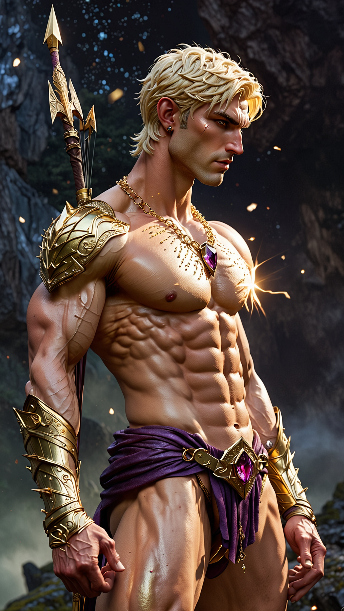Sidhe Elf in the Dream Realm. He kneels upon a cloud, his bow is drawn and and aimed. The bow is gold, the arrow has a sharp crystal tip, light shining from the arrowhead. His gaze is intense as he aims for his target, his brow furrowed. He is shirtless, his muscles tight and body glistening with sweat and glitter. The hair under his arms thick and visible. He wears reflective metallic gold paulfrons upon his muscled shoulders. A gold chain with an amethyst crystal pendant around his neck. His golden blond hair is shaved short in the back and sides {{{short hair}}}, longer on top and spiky, which makes his elven ears more obvious, a golden metallic headband with an amethyst jewel at the center around his head. His eyes are like opals, bright and intense, changing with his moods. His face is handsome, masculine, hairless, aside from his thick manly brows. Strong brow and jaw, cleft chin. He wears metallic gold bracers on his strong arms, and metallic gold boots. His legs are bare, roped with muscle. His groin barely covered by a metallic gold loincloth, the middle part draped over his massive genitals. Wide shouldered, narrow waist, sinewy, well defined, light blonde hair on chest, narrow trail of hair on abs. Full body pose, the stars shining down upon him... (((Short hair!)))