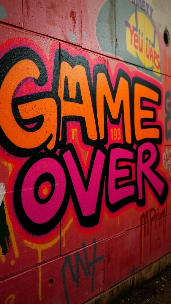 Photo of vibrant wall covered in dark graffiti "Game Over". Probably taken from a phone.