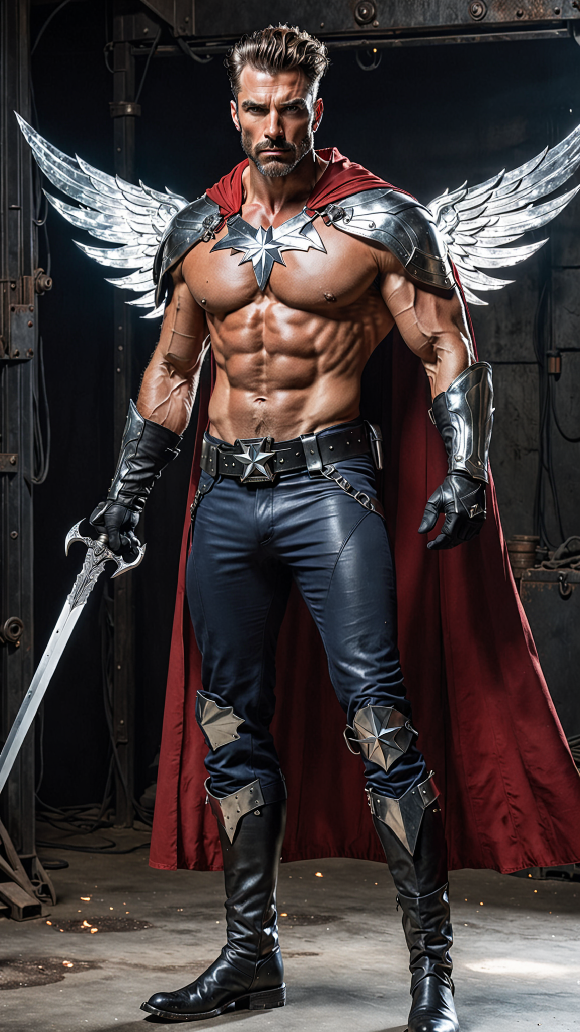 The American Revolution meets Sci-Fi. Hypermasculine, Caucasian male. Blacksmith, sword fighter. Tall, muscular, sinewy, strong, broad chest, wide shoulders and back, narrow waist. Handsome rugged face, strong brow and jaw, strong chin. Lapis blue eyes with thick silver eyebrows. Silver goatee on face, well trimmed. Medium length silver hair, wavy pompadour cut short on sides and back, tousled on top. Eight-pointed black star tattoo over the left eye. Black leather harness across his bare muscular chest, buckled on the right side. Large silver metal pauldrons and shoulder pads on both shoulders. Scarlet red tights/pants with white shooting star symbols down the sides of his thighs, stretched over muscular legs and a bulging crotch. Black leather bucket boots, turned down at the knees. Black leather gloves, turned down at the elbows. A wide silver tech belt with black accents around his waist, meeting at a v-shape above his crotch. A short royal blue cape with a white shooting-star symbol, split down the back to resemble wings. He wields a huge silver electrified techno shortsword, electric voltage emitting from the blade. He also carries a techno shield, transparent and also electrified. full body pose.