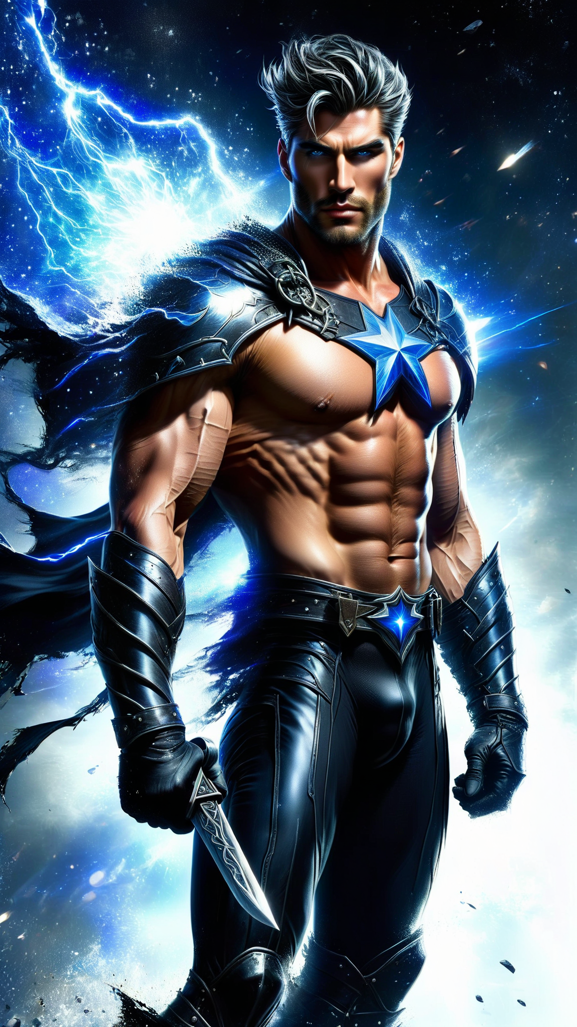 The American Revolution meets Sci-Fi. Hypermasculine, Caucasian male. Blacksmith, sword fighter. Tall, muscular, sinewy, strong, broad chest, wide shoulders and back, narrow waist. Handsome rugged face, strong brow and jaw, strong chin. Lapis blue eyes with thick silver eyebrows. Silver goatee on face, well trimmed. Medium length silver hair, wavy pompadour cut short on sides and back, tousled on top. Eight-pointed black star tattoo over the left eye. Black leather harness across his bare muscular chest, buckled on the right side. Large silver metal pauldrons and shoulder pads on both shoulders. Scarlet red tights/pants with white shooting star symbols down the sides of his thighs, stretched over muscular legs and a bulging crotch. Black leather bucket boots, turned down at the knees. Black leather gloves, turned down at the elbows. A wide silver tech belt with black accents around his waist, meeting at a v-shape above his crotch. A short royal blue cape with a white shooting-star symbol, split down the back to resemble wings. He wields a huge silver electrified techno shortsword, electric voltage emitting from the blade. He also carries a techno shield, transparent and also electrified. full body pose.