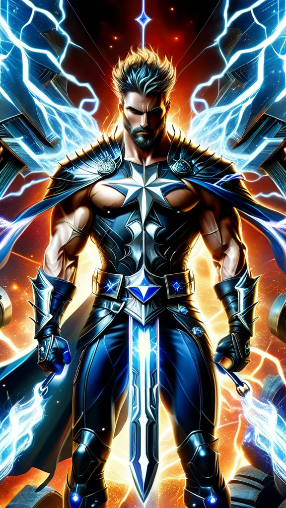 The American Revolution meets Sci-Fi. Hypermasculine, Caucasian male. Blacksmith, sword fighter. Tall, muscular, sinewy, strong, broad chest, wide shoulders and back, narrow waist. Handsome rugged face, strong brow and jaw, strong chin. Lapis blue eyes with thick silver eyebrows. Silver goatee on face, well trimmed. Medium length silver hair, wavy pompadour cut short on sides and back, tousled on top. Eight-pointed black star tattoo over the left eye. Black leather harness across his bare muscular chest, buckled on the right side. Large silver metal pauldrons and shoulder pads on both shoulders. Scarlet red tights/pants with white shooting star symbols down the sides of his thighs, stretched over muscular legs and a bulging crotch. Black leather bucket boots, turned down at the knees. Black leather gloves, turned down at the elbows. A wide silver tech belt with black accents around his waist, meeting at a v-shape above his crotch. A short royal blue cape with a white shooting-star symbol, split down the back to resemble wings. He wields a huge silver electrified techno shortsword, electric voltage emitting from the blade. He also carries a techno shield, transparent and also electrified. full body pose.
