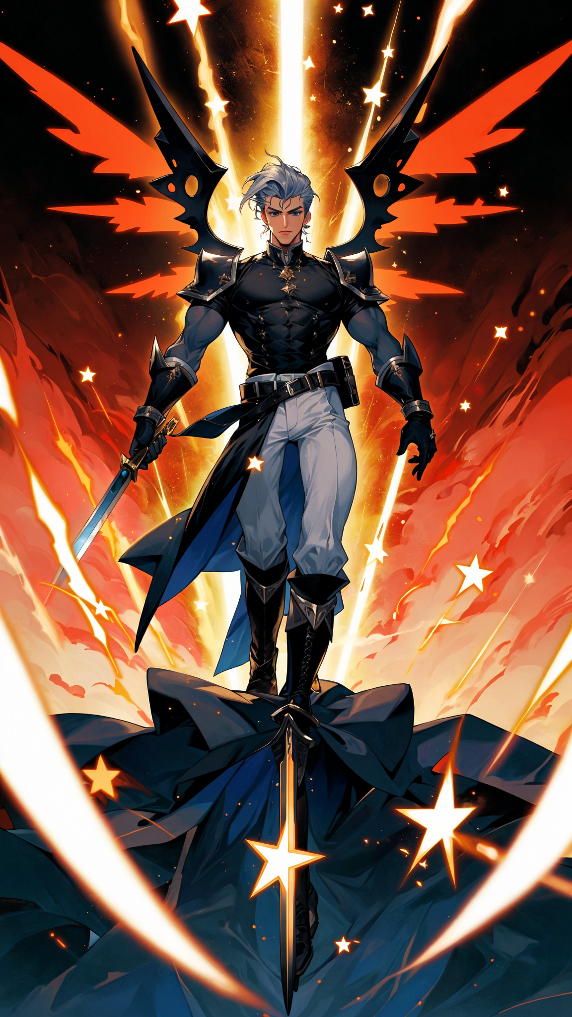 The American Revolution meets Sci-Fi. Hypermasculine, Caucasian male. Blacksmith, sword fighter. Tall, muscular, sinewy, strong, broad chest, wide shoulders and back, narrow waist. Handsome rugged face, strong brow and jaw, strong chin. Lapis blue eyes with thick silver eyebrows. Silver goatee on face, well trimmed. Medium length silver hair, wavy pompadour cut short on sides and back, tousled on top. Eight-pointed black star tattoo over the left eye. Black leather harness across his bare muscular chest, buckled on the right side. Large silver metal pauldrons and shoulder pads on both shoulders. Scarlet red tights/pants with white shooting star symbols down the sides of his thighs, stretched over muscular legs and a bulging crotch. Black leather bucket boots, turned down at the knees. Black leather gloves, turned down at the elbows. A wide silver tech belt with black accents around his waist, meeting at a v-shape above his crotch. A short royal blue cape with a white shooting-star symbol, split down the back to resemble wings. He wields a huge silver electrified techno shortsword, electric voltage emitting from the blade. He also carries a techno shield, transparent and also electrified. full body pose.