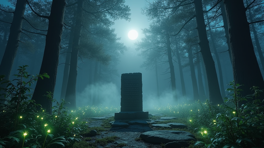 Ethereal forest clearing, bioluminescent plants, mist-covered ground, moonlit sky, ancient stone tablet with legible runes