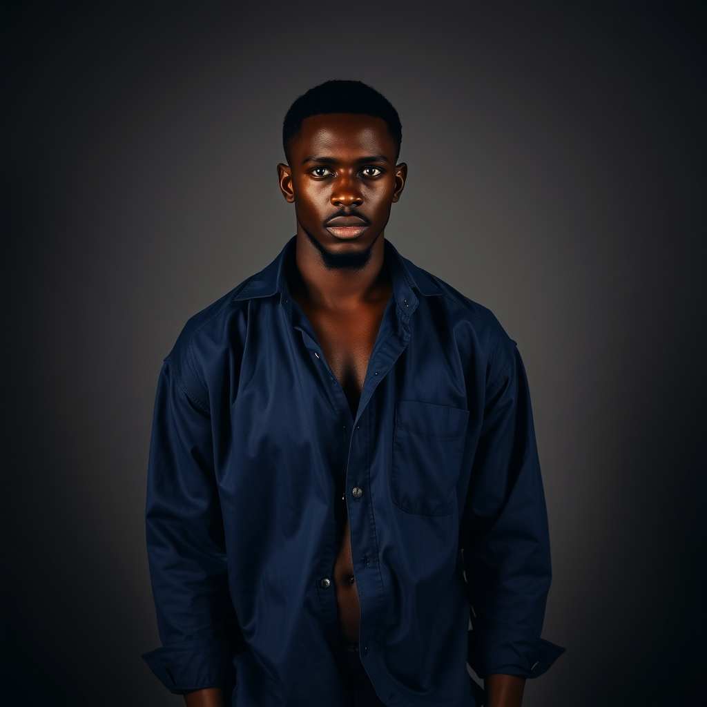 Soft Lighting Photography by Mimoza Veliu and Mario Giacomelli, handsome African man 36 years old, black bold, loose oversized blue shirt, bushop collar, petite body, beautiful legs, realistic soft skin, analog photo, Cinematic,