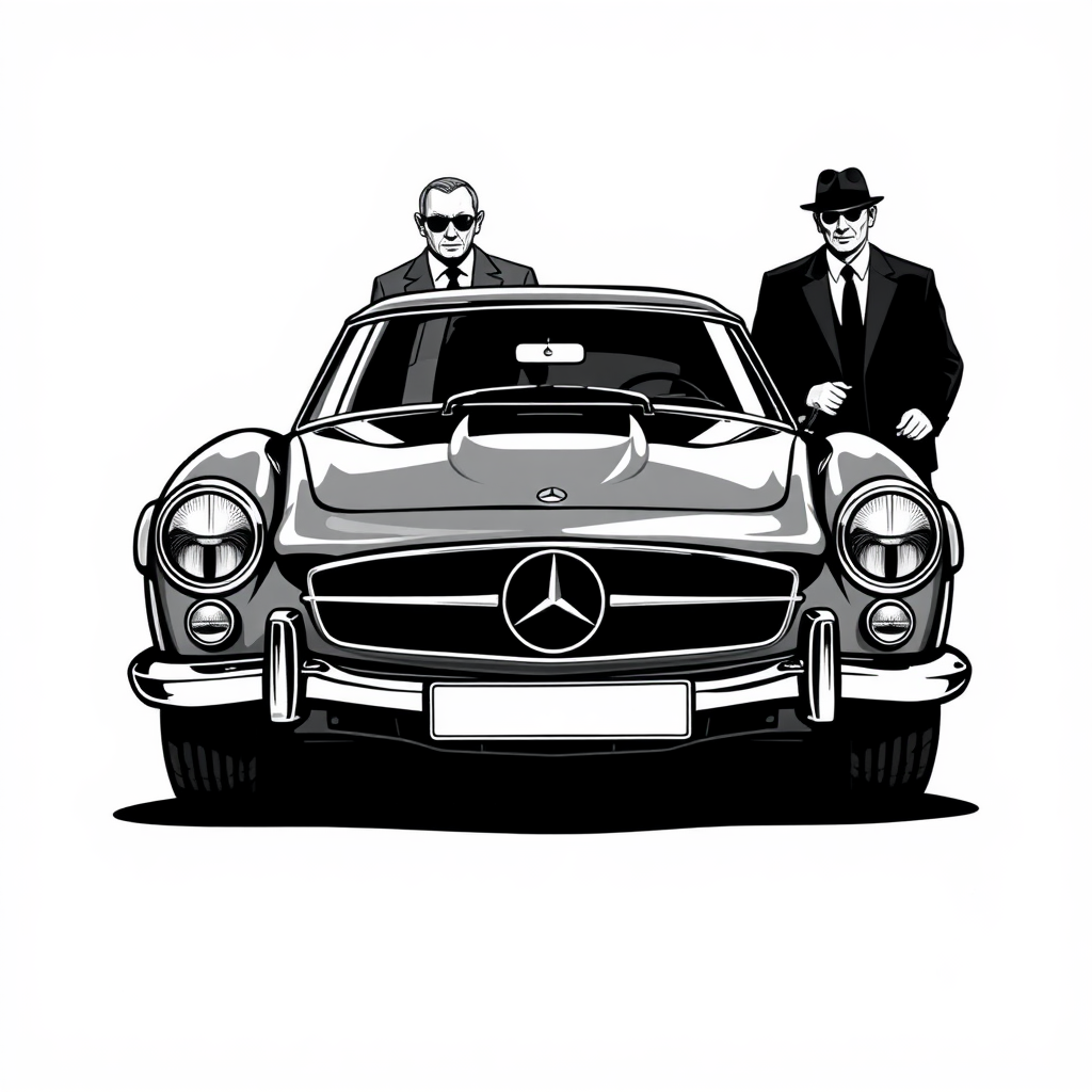 Give me a drawing of a Mercedes car and the gangsters behind it.