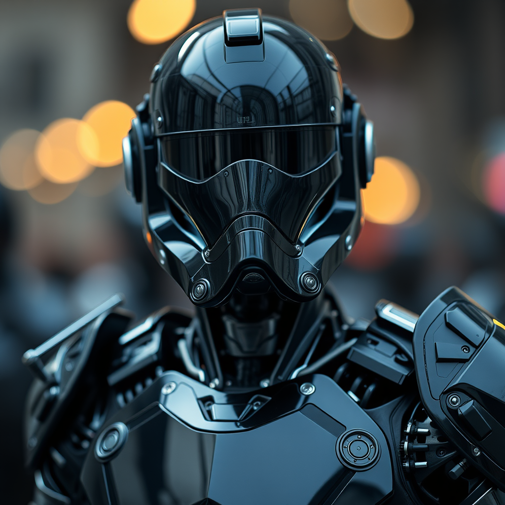 portrait of a guard android, robotic, mechanical, black reflective armour, metal plating, 80mm, f/1.8, dof, bokeh, depth of field