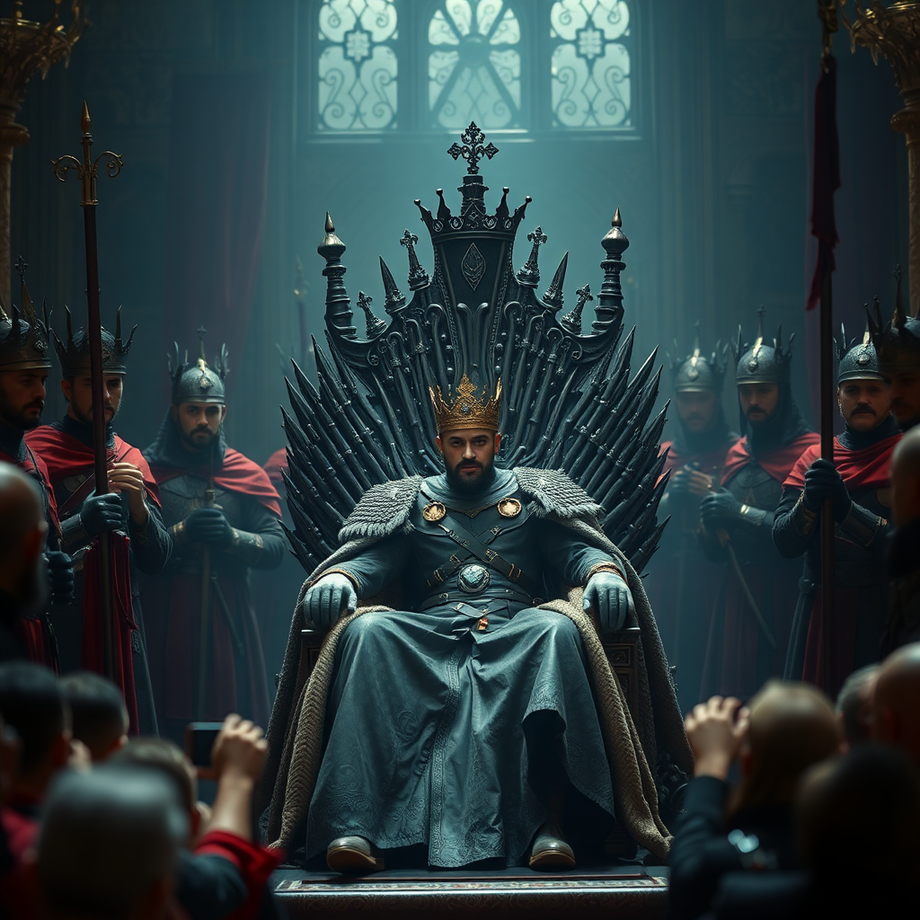 a king crowned as a new King, surounded by his own the Kings Guard, making a speech to his people inside the palace,the king is siting on the iron throne from the Game of Thrones,the picture is taken from the top,4K,3D, with depth details.