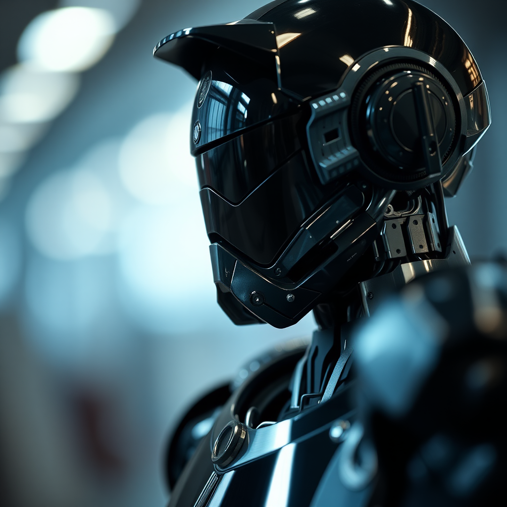 portrait of a guard android, robotic, mechanical, black reflective armour, metal plating, 80mm, f/1.8, dof, bokeh, depth of field