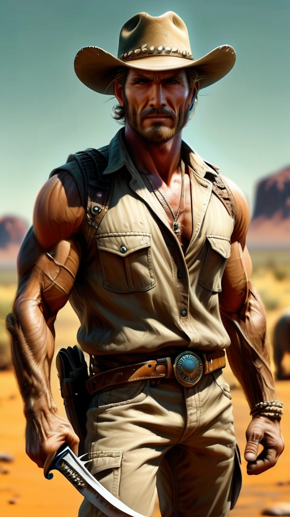 Protector of the Outback, Australian hunter, hypermasculine male. Tall, athletic, strong, muscular, sinewy, well defined manly man. Caucasian male with clear Teal eyes, strong brow and squared jaw, blonde goatee on his face, usually a surly smile. Medium length sandy-blonde hair that he wears combed back, usually underneath a Crocodile Dundee type of hat. The hat is an Outback Sidewinder, dark tan with crocodile teeth around the band. He also wears a sleeveless tan camouflage fatigue jacket, unbuttoned and exposing his chest. His chest and abs are well defined. Gold chain with spear shaped pendant and bolo tie around his neck. Tan khaki cargo pants cover his strong, powerful legs and obvious crotch bulge. Dark brown alligator cowboy boots on his feet. He carries a machete when travelling through the Outback. Full body pose. Travelling through the Outback. Tan khaki cargo pants. [[masterpiece]]