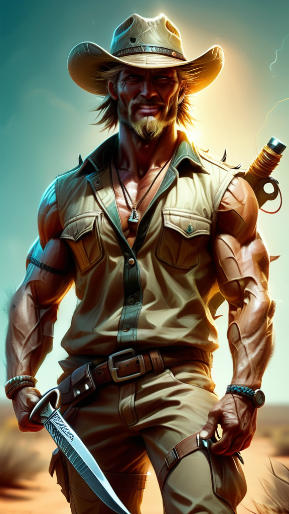 Protector of the Outback, Australian hunter, hypermasculine male. Tall, athletic, strong, muscular, sinewy, well defined manly man. Caucasian male with clear Teal eyes, strong brow and squared jaw, blonde goatee on his face, usually a surly smile. Medium length sandy-blonde hair that he wears combed back, usually underneath a Crocodile Dundee type of hat. The hat is an Outback Sidewinder, dark tan with crocodile teeth around the band. He also wears a sleeveless tan camouflage fatigue jacket, unbuttoned and exposing his chest. His chest and abs are well defined. Gold chain with spear shaped pendant and bolo tie around his neck. Tan khaki cargo pants cover his strong, powerful legs and obvious crotch bulge. Dark brown alligator cowboy boots on his feet. He carries a machete when travelling through the Outback. Full body pose. Travelling through the Outback. Tan khaki cargo pants. [[masterpiece]]