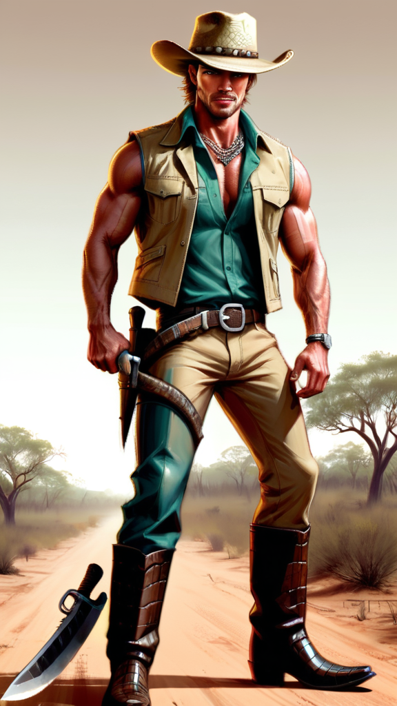 Protector of the Outback, Australian hunter, hypermasculine male. Tall, athletic, strong, muscular, sinewy, well defined manly man. Caucasian male with clear Teal eyes, strong brow and squared jaw, blonde goatee on his face, usually a surly smile. Medium length sandy-blonde hair that he wears combed back, usually underneath a Crocodile Dundee type of hat. The hat is an Outback Sidewinder, dark tan with crocodile teeth around the band. He also wears a sleeveless tan camouflage fatigue jacket, unbuttoned and exposing his chest. His chest and abs are well defined. Gold chain with spear shaped pendant and bolo tie around his neck. Tan khaki cargo pants cover his strong, powerful legs and obvious crotch bulge. Dark brown alligator cowboy boots on his feet. He carries a machete when travelling through the Outback. Full body pose. Travelling through the Outback. Tan khaki cargo pants. [[masterpiece]]