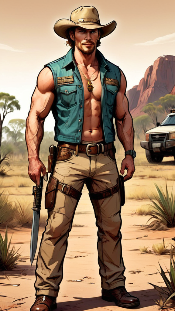 Protector of the Outback, Australian hunter, hypermasculine male. Tall, athletic, strong, muscular, sinewy, well defined manly man. Caucasian male with clear Teal eyes, strong brow and squared jaw, blonde goatee on his face, usually a surly smile. Medium length sandy-blonde hair that he wears combed back, usually underneath a Crocodile Dundee type of hat. The hat is an Outback Sidewinder, dark tan with crocodile teeth around the band. He also wears a sleeveless tan camouflage fatigue jacket, unbuttoned and exposing his chest. His chest and abs are well defined. Gold chain with spear shaped pendant and bolo tie around his neck. Tan khaki cargo pants cover his strong, powerful legs and obvious crotch bulge. Dark brown alligator cowboy boots on his feet. He carries a machete when travelling through the Outback. Full body pose. Travelling through the Outback. Tan khaki cargo pants. [[masterpiece]]