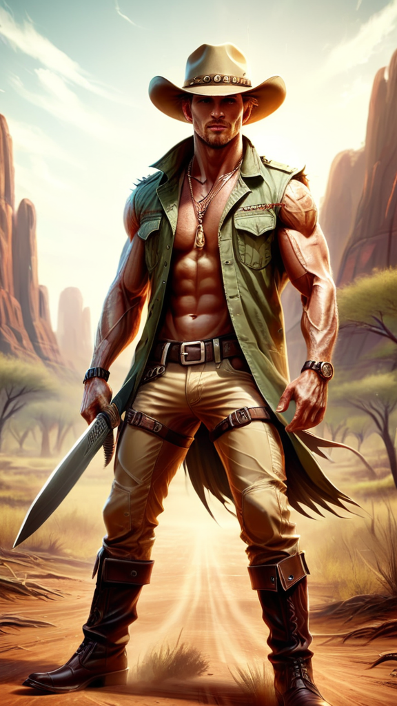 Protector of the Outback, Australian hunter, hypermasculine male. Tall, athletic, strong, muscular, sinewy, well defined manly man. Caucasian male with clear Teal eyes, strong brow and squared jaw, blonde goatee on his face, usually a surly smile. Medium length sandy-blonde hair that he wears combed back, usually underneath a Crocodile Dundee type of hat. The hat is an Outback Sidewinder, dark tan with crocodile teeth around the band. He also wears a sleeveless tan camouflage fatigue jacket, unbuttoned and exposing his chest. His chest and abs are well defined. Gold chain with spear shaped pendant and bolo tie around his neck. Tan khaki cargo pants cover his strong, powerful legs and obvious crotch bulge. Dark brown alligator cowboy boots on his feet. He carries a machete when travelling through the Outback. Full body pose. Travelling through the Outback. Tan khaki cargo pants. [[masterpiece]]