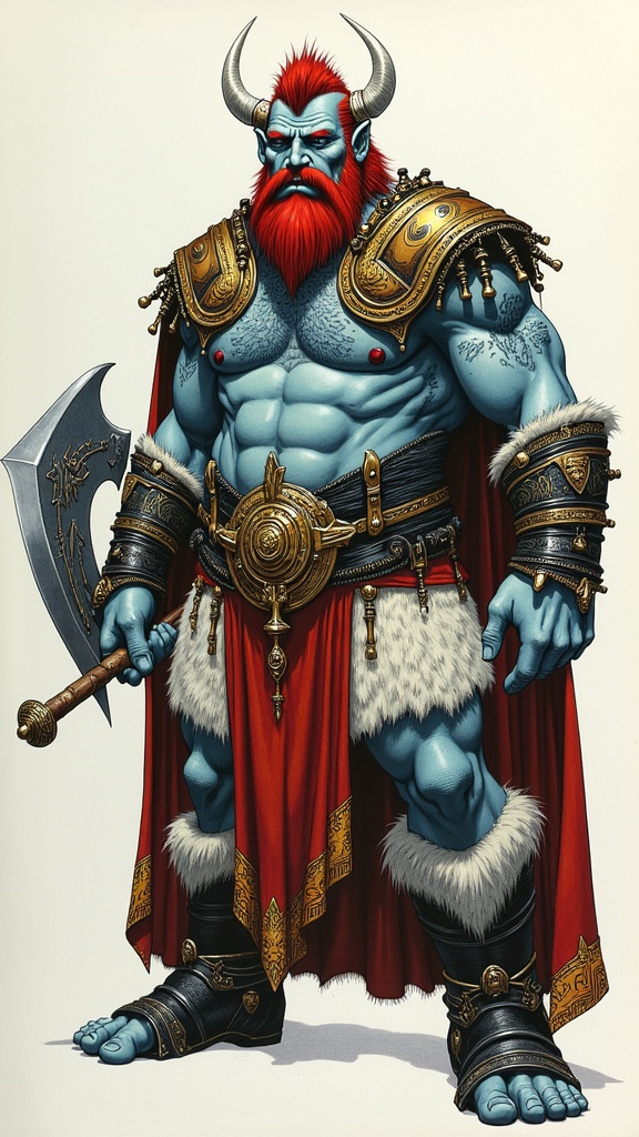 From the realm of faeries and fantasy. A handsome troll with pale blue skin (((blue skin))). Warrior, barbarian, giant. He wields a giant Viking war axe. Tall, strong, big muscles, muscular, sinewy, broad chested, wide back, narrow waist, bodybuilder. Short fiery red hair, mullet with fluffy middle-parted bangs. White steer horns curved upwards from the front of his temples. Handsome masculine rugged face, Icy blue eyes, strong brow and jaw. Dark red neatly trimmed Beard, close to face with sideburns. Golden pauldrons trimmed with black on broad shoulders. Black leather bondage harness on his bare chest, dark blue tribal tattoos on his chest. Black leather bracers on strong arms. White fur loincloth covering his girth, exposing strong muscular legs, a golden Viking styled belt trimmed with black around his waist. Knee-high black leather boots with white fur tops. A Scarlet-red short cape with golden-yellow Viking designs trim around the edges. Full body pose, axe raised in warrior stance, red hair in his armpits. {{MASTERPIECE}}