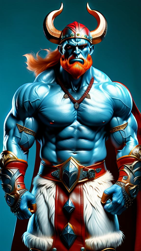 From the realm of faeries and fantasy. A handsome troll with pale blue skin (((blue skin))). Warrior, barbarian, giant. He wields a giant Viking war axe. Tall, strong, big muscles, muscular, sinewy, broad chested, wide back, narrow waist, bodybuilder. Short fiery red hair, mullet with fluffy middle-parted bangs. White steer horns curved upwards from the front of his temples. Handsome masculine rugged face, Icy blue eyes, strong brow and jaw. Dark red neatly trimmed Beard, close to face with sideburns. Golden pauldrons trimmed with black on broad shoulders. Black leather bondage harness on his bare chest, dark blue tribal tattoos on his chest. Black leather bracers on strong arms. White fur loincloth covering his girth, exposing strong muscular legs, a golden Viking styled belt trimmed with black around his waist. Knee-high black leather boots with white fur tops. A Scarlet-red short cape with golden-yellow Viking designs trim around the edges. Full body pose, axe raised in warrior stance, red hair in his armpits. {{MASTERPIECE}}