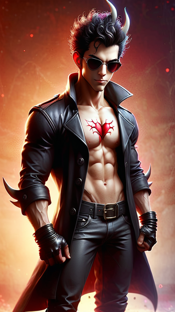 Super-hero. Sex symbol. DEMON?!!! He used to be a bad guy, now he fights the good fight against evil! He's part of a super-hero team, and he brings the rage and the beat-down when neccessary--- but he's so cute while doing it, and all the girls just love him! Medium height but muscular, sinewy, well defined, lithe. Masculine Caucasian male, handsome and cute. Hairless face other than soul-patch. Black curly hair in a tight faux-hawk, shaved on the sides and back, curly up top. Pointed ears. Sometimes during battle or an angry moment, a small pair of ivory white horns will pop out of his temples. His eyes glow red, but they're usually behind a pair of dark sunglasses. His fangs only show if he's angry or smiling-- he usually smiling and winking at some cute girl. He has retractable claws, they only pop out during battle. He prefers to wear muscle crop-top shirts to show off his abs, and really form-fitting pants to show off "other things". A pair of black leather combat boots on his feet. He wears a black trenchcoat with the sleeves cut off, open to reveal his outfit. He has a prehensile tail with a heart shaped tip, he usually keeps that hidden under the trenchcoat unless he's in battle or teasing some cute girl. He loves all the flirting and great PR he gets with his group. Full body pose, probably winking and smiling at some cute girl! {{{Prehensile tail with heart shaped tip}}}