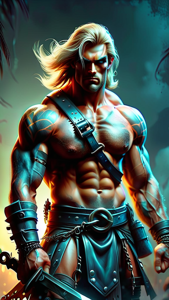 Post Apocalyptic Sci-Fi dystopia, futuristic Barbarian. Hypermasculine male, manly, tall, muscular, brute, sinewy, broad chested, bodybuilder. Light-blue eyes, strong brow and squared chin. No facial hair aside from a soul patch. Long, wild golden blonde shoulder length hair that falls over face. Black X pattern tattooed over eyes/face. Black leather harness and straps over bare chest. Silver chains wrapped around biceps, black leather bracers on arms. Chain metal kilt barely covering his strong, powerful legs. Knee- high black leather boots with many buckles. Full body pose. He carries a gigantic battle sword that he wields easily because of his Olympic body.