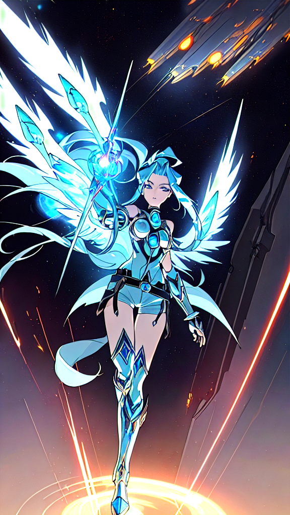 Futuristic Sci-Fi meets mythology and spirituality. Battle goddess, goddess of vengence and retribution. Avenging Angel, God's favorite destroyer of evil, demon killer, galactic traveller, space goddess. Her avatar is that of an otherworldly being; she is tall, strong, athletic, statuesque. Her skin is the color and fabric of the universe, you can see stars and galaxies within her physicality. Her eyes are two new-born stars, shining brightly. Her hair is jet-black medium length and spiky, swept back on the sides, also reflecting the universe. Chrome pauldrons on her shoulders with white gems lit up from within. Chrome bracers on her arms, chrome breastplate with glowing white glyphs, chrome tech belt on her waist with glowing blue stone at the center. Chrome shorts/ short pteruges, chrome thigh guards. Chrome knee-high boots with heels, glowing white glyphs within the boots. She has six huge flaming wings of fire like a seraphim, composed of bright blue flames. She carries a gigantic flaming blue sword of light and fire. She has more than enough power and glory to destroy whatever evil confronts her. When The Creator sets her to a task, she does not stop until it's completed or The Creator calls her off. Full body pose, in space defending a galaxy, the stars reflected off her chrome outfit. {{{6 flaming wings of bright blue fire}}} {{{MASTERPIECE}}}
