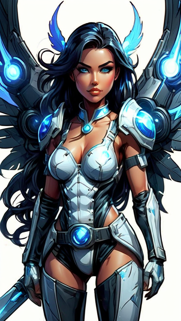 Futuristic Sci-Fi meets mythology and spirituality. Battle goddess, goddess of vengence and retribution. Avenging Angel, God's favorite destroyer of evil, demon killer, galactic traveller, space goddess. Her avatar is that of an otherworldly being; she is tall, strong, athletic, statuesque. Her skin is the color and fabric of the universe, you can see stars and galaxies within her physicality. Her eyes are two new-born stars, shining brightly. Her hair is jet-black medium length and spiky, swept back on the sides, also reflecting the universe. Chrome pauldrons on her shoulders with white gems lit up from within. Chrome bracers on her arms, chrome breastplate with glowing white glyphs, chrome tech belt on her waist with glowing blue stone at the center. Chrome shorts/ short pteruges, chrome thigh guards. Chrome knee-high boots with heels, glowing white glyphs within the boots. She has six huge flaming wings of fire like a seraphim, composed of bright blue flames. She carries a gigantic flaming blue sword of light and fire. She has more than enough power and glory to destroy whatever evil confronts her. When The Creator sets her to a task, she does not stop until it's completed or The Creator calls her off. Full body pose, in space defending a galaxy, the stars reflected off her chrome outfit. {{{6 flaming wings of bright blue fire}}} {{{MASTERPIECE}}}