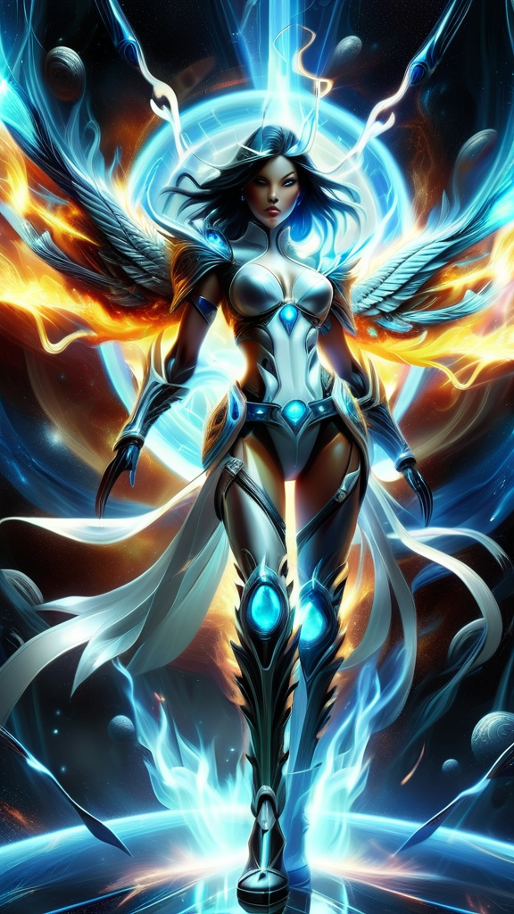 Futuristic Sci-Fi meets mythology and spirituality. Battle goddess, goddess of vengence and retribution. Avenging Angel, God's favorite destroyer of evil, demon killer, galactic traveller, space goddess. Her avatar is that of an otherworldly being; she is tall, strong, athletic, statuesque. Her skin is the color and fabric of the universe, you can see stars and galaxies within her physicality. Her eyes are two new-born stars, shining brightly. Her hair is jet-black medium length and spiky, swept back on the sides, also reflecting the universe. Chrome pauldrons on her shoulders with white gems lit up from within. Chrome bracers on her arms, chrome breastplate with glowing white glyphs, chrome tech belt on her waist with glowing blue stone at the center. Chrome shorts/ short pteruges, chrome thigh guards. Chrome knee-high boots with heels, glowing white glyphs within the boots. She has six huge flaming wings of fire like a seraphim, composed of bright blue flames. She carries a gigantic flaming blue sword of light and fire. She has more than enough power and glory to destroy whatever evil confronts her. When The Creator sets her to a task, she does not stop until it's completed or The Creator calls her off. Full body pose, in space defending a galaxy, the stars reflected off her chrome outfit. {{{6 flaming wings of bright blue fire}}} {{{MASTERPIECE}}}