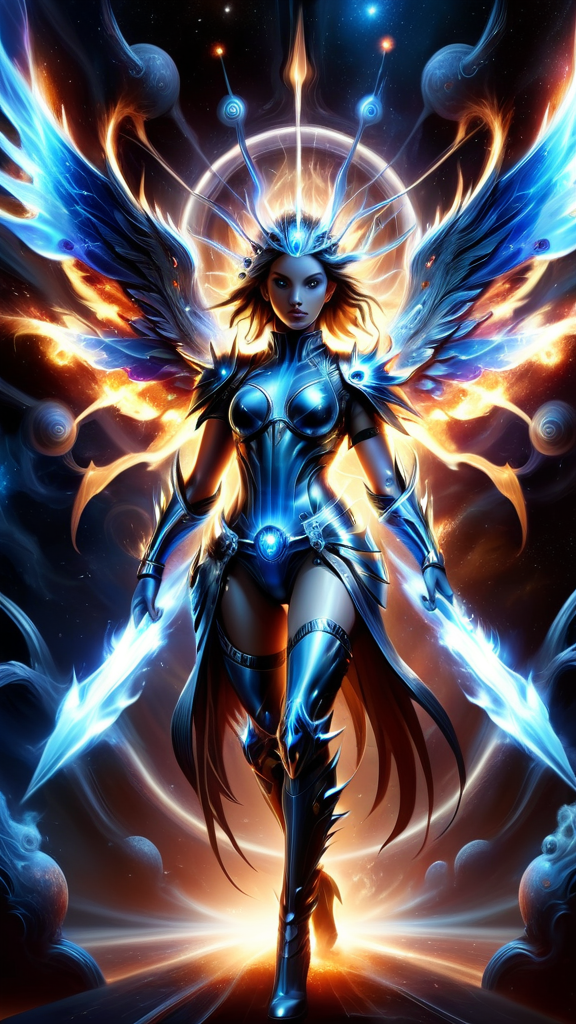 Futuristic Sci-Fi meets mythology and spirituality. Battle goddess, goddess of vengence and retribution. Avenging Angel, God's favorite destroyer of evil, demon killer, galactic traveller, space goddess. Her avatar is that of an otherworldly being; she is tall, strong, athletic, statuesque. Her skin is the color and fabric of the universe, you can see stars and galaxies within her physicality. Her eyes are two new-born stars, shining brightly. Her hair is jet-black medium length and spiky, swept back on the sides, also reflecting the universe. Chrome pauldrons on her shoulders with white gems lit up from within. Chrome bracers on her arms, chrome breastplate with glowing white glyphs, chrome tech belt on her waist with glowing blue stone at the center. Chrome shorts/ short pteruges, chrome thigh guards. Chrome knee-high boots with heels, glowing white glyphs within the boots. She has six huge flaming wings of fire like a seraphim, composed of bright blue flames. She carries a gigantic flaming blue sword of light and fire. She has more than enough power and glory to destroy whatever evil confronts her. When The Creator sets her to a task, she does not stop until it's completed or The Creator calls her off. Full body pose, in space defending a galaxy, the stars reflected off her chrome outfit. {{{6 flaming wings of bright blue fire}}} {{{MASTERPIECE}}}