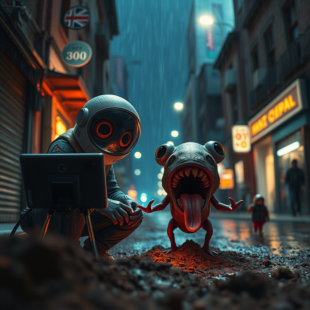spaceship operator working at night in rainny street with strange cute friendly creatures with huge eyes, mouth, long tongue and round teeth appearing from dirt, in the style of gehry and gaudi, macro lens, highly detailed, shallow depth of fielf, digital painting, trending artstation, concept art, illustration, cinematic lighting, vibrant colors, photorealism, epic, octane render