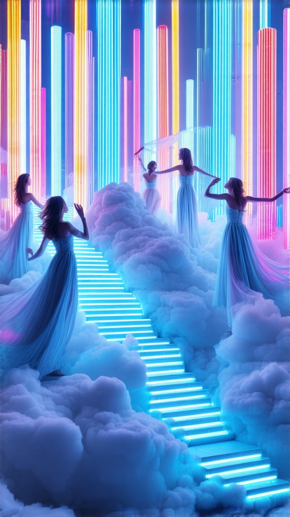 Xanadu. Mythology meets modern times. Light, wind, neon, beautiful muses. High up in the clouds, sunlight filters through them. Brightly lit pillars of neon in various colors extend upwards to the sky. There are stairlike landings within the clouds, and all 9 of the beautiful muses from Xanadu are dancing on them in different poses. They all wear silky silvery-white tiered skirtlike frocks that billow freely in the wind. There is sparkly magic within the clouds because they are there. They ascend, leaving trails of light. A bright neon dance club within the clouds, as they celebrate.