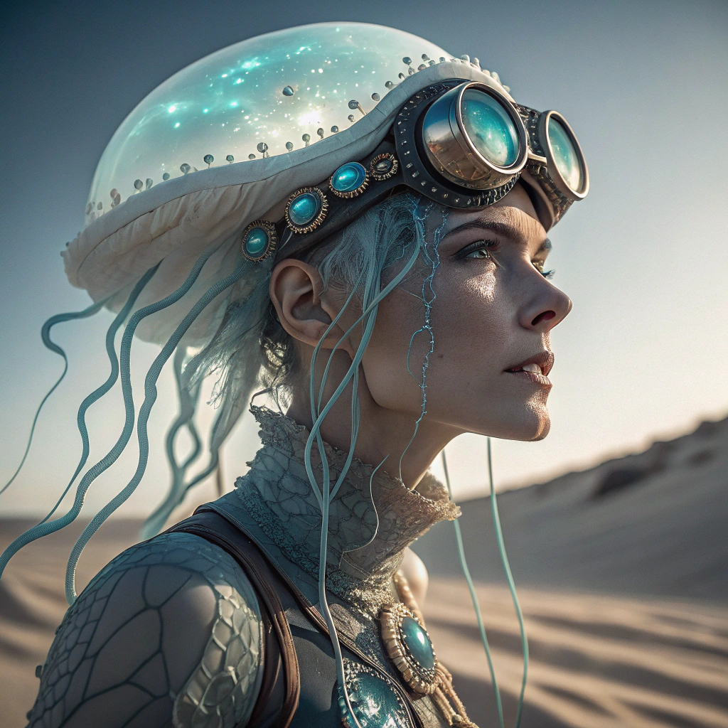 Ethereal cyborg woman, bioluminescent jellyfish headdress. Steampunk goggles blend with translucent tentacles. Cracked porcelain skin meets iridescent scales. Mechanical implants and delicate tendrils intertwine. Human features with otherworldly glow. Dreamy aquatic hues contrast weathered metal. Reflective eyes capture unseen worlds. Soft bioluminescence meets harsh desert backdrop. Fusion of organic and synthetic, ancient and futuristic. Hyper-detailed textures, surreal atmosphere.