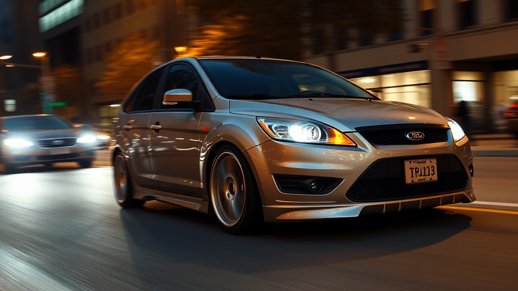A modified 2009 model Ford Focus driving on the dimly lit street