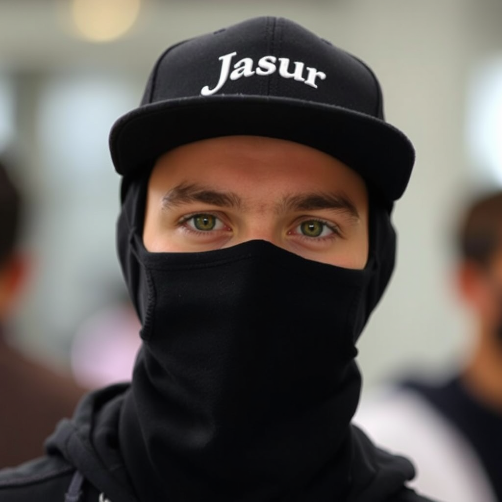 A 19-year-old man in a black mask, he has a black cap on his head. "Jasur" is printed on the cap, real