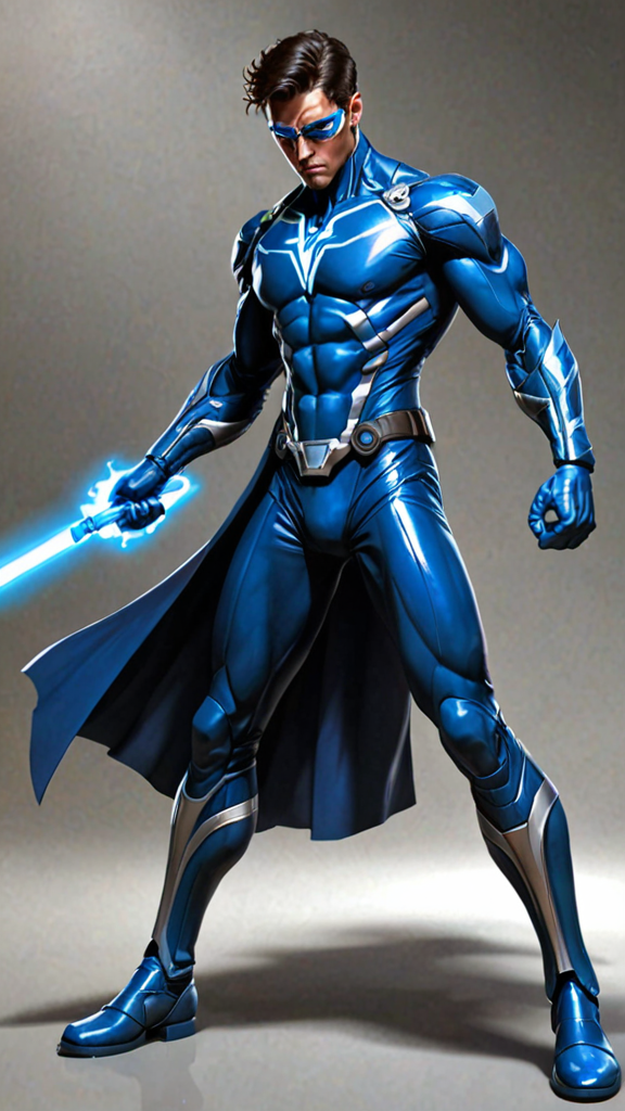 Futuristic Sci-Fi super-hero. Telepath, mind warrior. He can create a bright blue energy blade from either of his hands, and can make this energy shrink or expand by will. This energy blade can do mind damage as well as physical damage, a shock to his opponent's neurosystem or electroshock to their body. He also has an ability to defy gravity and walk/run among the walls and ceiling. He can dodge bullets or anything else projected at him. Tall, thin, lithe but muscular, sinewy, well defind. Masculine Caucasian male. Thin but handsome face with dark eyes, chiseled jaw and strong brow. Smooth, hairless face. Straight dark brown hair, fade hairstyle cut close on sides and back, longer on top with middle parted bangs falling over his eyes. He usually wears a pair of dark sunglasses to hide the bluish glow from his eyes. Cobalt blue spandex suit with silver glyphs and circuitry patterns down the arms, legs and chest. A dark blue tech belt around his waist, dark blue knee-high boots, and a large flowing dark blue trenchcoat, open to reveal his uniform. Full body pose, energy blade extended from his fist and glowing bright blue.