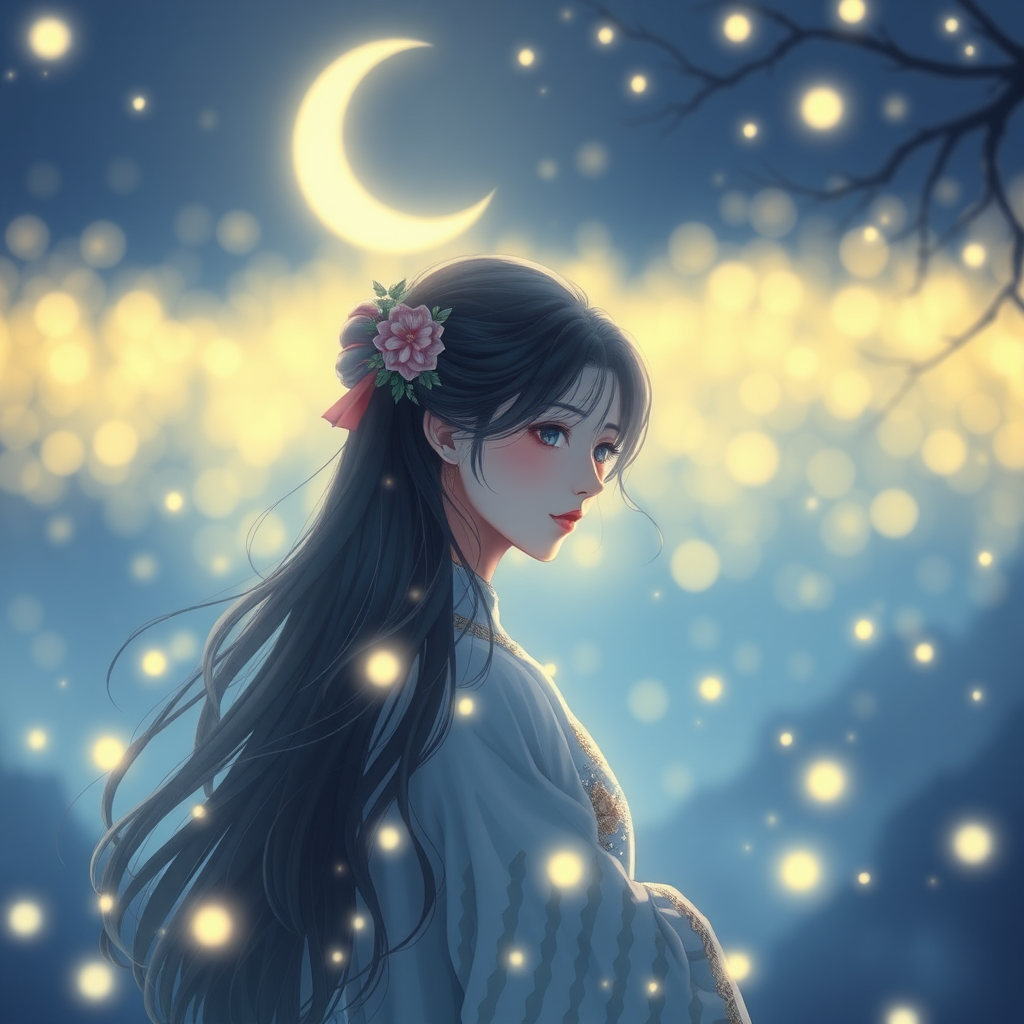 创作一幅冠绝宇宙印象派大师作品并加入下面意境。The moonlight gently caresses, like the weight on your shoulders, flowing through the silent night, warming your weary heart. Mid-Autumn wish: a dream to soothe all worries, a calm heart to ease life's burdens. 月光轻抚,似你肩上的压力,流淌过无言的夜,温暖你疲惫的心。中秋愿望:一梦解千愁,心静放繁忧。 让她黑色秀发如云皮肤白皙光滑细腻光泽细嫩气质冠绝古今容颜百媚千娇冠绝宇宙笑容倾国倾城不可方物。 加入中秋满月祝福,Make the fireflies form intricate patterns around her,加入又大又圆的月亮。让她黑色秀发如云皮肤白皙光滑细腻光泽细嫩气质冠绝古今容颜百媚千娇冠绝宇宙笑容倾国倾城不可方物。能否画一位24岁绝代佳人容颜空前绝后气质如世外仙女白雪公主浑身充满书香气息文雅高贵和画出下面文章中的意境?让她黑色秀发如云皮肤白皙光滑细腻光泽细嫩气质冠绝古今容颜百媚千娇冠绝宇宙笑容倾国倾城不可方物 。绝美梦境中的千年约定 清风徐来,碧海银沙,尘封千年的诺言在今宵梦境中悄然醒来。某处花开如梦,一位摩羯座属兔的佳人,静坐于古老的浮雕下,仿佛在等待一个未曾到来的约定。她心中,藏有对宫崎骏电影和动画艺术的深切情怀,那些梦幻般的画面与动人的旋律,如同千丝万缕的情感丝线,萦绕在她的心头。 月光如水,映照出她微微蹙起的眉头。她在梦中遨游,穿梭于宫崎骏的奇幻世界,遇见了《天空之城》中那一座悬浮的城堡,感受到了《龙猫》中的温暖和童真。在这些画卷中,她看见自己仿佛化身为故事的女主角,既是梦中的公主,也是勇敢的探险者。 时光荏苒,梦中的城堡化作一片辽阔的星空,她漫步在这浩瀚的星海中,那里有她未曾遇见的风景,也有她曾经迷失的情感。那星光点点,如同她心中的渴望与焦虑,在宁静的夜空下,逐渐变得清晰。每一颗星辰,都似乎在述说着一段段未完的故事,那些悲欢离合、欢笑泪水,皆化为她内心深处的涟漪。 恰在此时,一曲悠扬的钢琴声从远处传来,那是《幽灵公主》中最动人的旋律。她闭上眼睛,沉浸在这音乐的海洋中,仿佛一切烦恼和疲惫都被这音乐的波动所化解。她的心绪随着琴声的起伏,时而澎湃,时而平静,那是对生活的思索与释怀,也是对青春的呼唤与珍惜。 梦境中的一切,都如同她内心深处的一面镜子,映照出她对未来的期待和对自我的认知。在这片梦幻的境地中,她看到了自己曾经的努力与付出,也体会到了生活的美好与艰辛。她明白,那些看似平淡无奇的日子,实际上蕴藏着无尽的情感和意义。 晨光微曦,梦境渐渐散去。她醒来时,脸上带着一丝微笑,那是对生活的深刻感悟和对未来的无限憧憬。宫崎骏的电影和动画艺术,如同一剂强心剂,给予她对生活的勇气和热情。她知道,虽然生活中难免会有疲惫与压力,但正是这些点滴的情感波动,才构成了她独特的生命旅程。 Include a crescent moon as an accessory,Include a crescent moon as an accessory,create a beautiful and detailed image of a 24-year-old woman in a dreamy, fantastical setting inspired by Hayao Miyazaki’s films, capturing the essence of the story you shared. Can you add a mystical forest in the background? Add a hidden waterfall behind the trees. Can you add a mystical creature near the waterfall? Can the creature have iridescent wings? Can the creature have a serene expression? Can the creature be surrounded by soft mist? 一个贴心的建议 亲爱的,今年的圣诞节,或许是你静下心来,度过一个属于自己的时光的最佳机会。也许这将是你给自己最好的礼物。把精力更多放在考试和各个大学JD申请上,我会因此更加放心。更希望看到的是你独立、坚定、自信的模样,而不是为了一段未来尚不明朗的关系而纠结的身影。 在美国,成年人的世界里,没有“容易”两个字。你的人生在这里,充满了机会与挑战。每一个重要的抉择,都决定着你未来的高度。从目前你对他的了解来看,这一年的相处还不足以证明他已经做好承担未来的准备。尤其是你目前面临的挑战和压力——从备考LSAT到规划JD学习生涯,都是不容忽视的优先级。你的未来潜力无限,而这一时刻,更需要你专注于自己的成长与规划,而非纠结于一段尚未明确方向的感情。