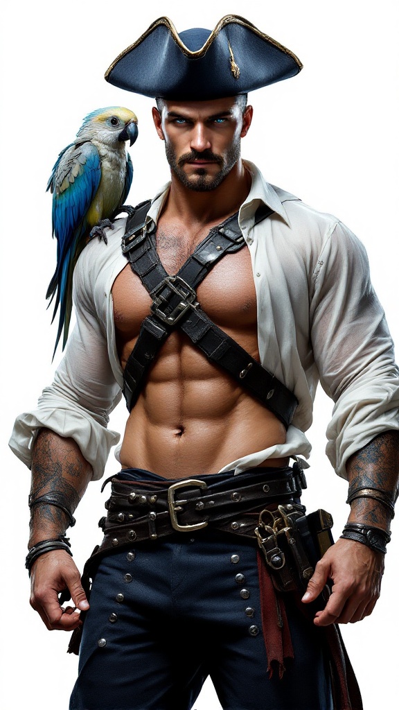 Sci-Fi, futuristic hero. Swashbuckler, space pirate, handsome intergalactic buccaneer. Tall, muscular, sinewy, big muscled, perfect physique. Broad chest, wide shoulders and back, narrow waist, muscular thighs and legs. Hirsute hairy chest, arms and legs. Handsome masuline rugged face with lapis-blue eyes, strong brow, squared jaw. Narrow mustache with soulpatch on face. He has a warm, sexy smile. Short dark brown curly fade with close cut on sides and back, longer curls on top. Dark blue tricorn pirate hat with silver grommets,and a white feather plume on the side. Black leather harness with silver buckle strapped across his chest. A loose-fitting sheer silky white long sleeved shirt with sliver threads, open to reveal his hairy chest. A wide black leather belt with silver studs around his waist. Tight dark blue pants with silver grommets down the sides tucked into knee-high black leather bucket boots. An alien parrot with multi-colored glowing neon feathers sits on his shoulder while his spaceship fires up for his next adventure. Full body pose, lookingbdashing and handsome. {{{MASTERPIECE}}}