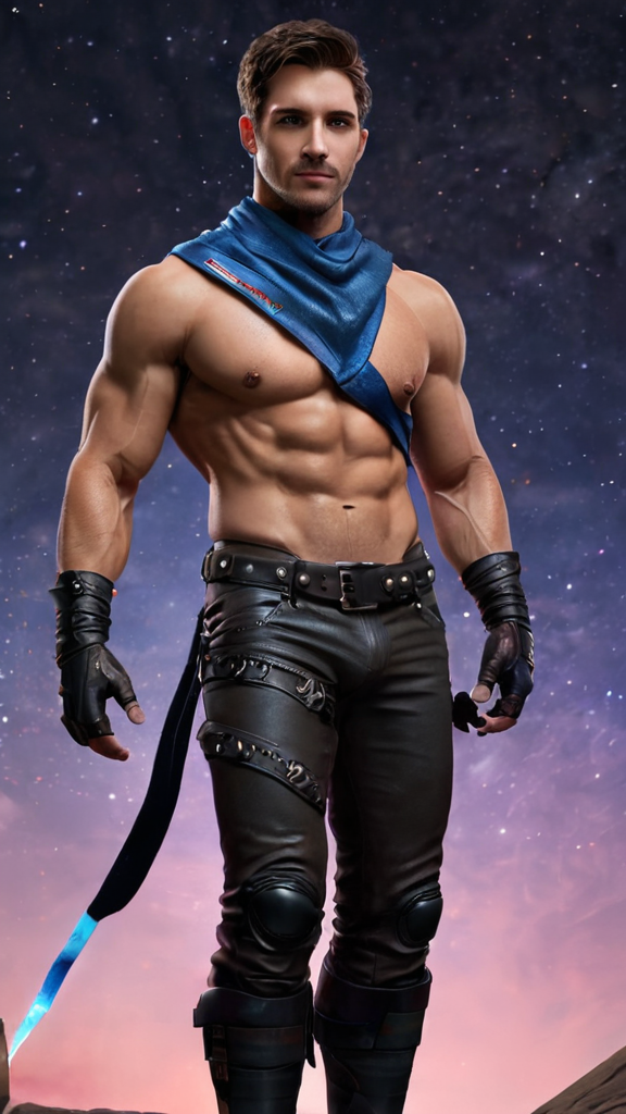 Sci-Fi, futuristic hero. Swashbuckler, space pirate, handsome intergalactic buccaneer. Masculine Caucasian male. Tall, muscular, sinewy, big muscled, perfect physique. Broad chest, wide shoulders and back, narrow waist, muscular thighs and legs. Hirsute hairy chest, arms and legs. Handsome masuline rugged face with lapis-blue eyes, strong brow, squared jaw. Soulpatch on otherwise hairless face. He has a warm, sexy smile. Short dark brown wavy fade hairstyle, close cut on sides and back, longer on top. Sapphire blue bandana with long ends tied around forehead. Black leather harness with silver buckle strapped across his shirtless hairy chest. Black leather bracers with silver grommets on his muscular arms. A wide black leather belt with silver studs around his waist. Tight sapphire blue pants with silver grommets down the sides tucked into knee-high black leather bucket boots. An alien parrot with multi-colored glowing neon feathers sits on his shoulder. He weilds a brightly glowing violet-blue lightsaber while his spaceship fires up for his next adventure. Full body pose, looking dashing and handsome, a galaxy swirling in the background. {{{MASTERPIECE}}}