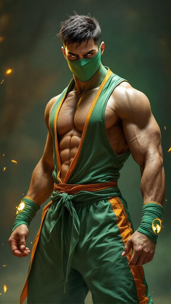 (((Masterpiece))) Super-hero, martial artist, street fighter. He absorbs sunlight and uses it to power his hits and strikes-- his hands glow with power. It also gives him some invulnerability. He keeps a praying mantis as a mascot and a pet. Hypermasculine male superhero, Caucasian male of European descent (((white male))), martial artist. Short black fade hairstyle. Strong jaw and brow, chiseled squared jaw, soul patch on face. Dark brown eyes, intense gaze. Jade green soft cloth super-hero mask covering eyes, tied in back his head, leaving the mouth, jaw and neck area exposed. Muscular, sinewy, athletic, strong. Loose fitting outfit, solid jade green with bright orange trim on the sides and the top, orange stripes down the sides of the pants. Form fitting top, deep plunging neckline and open on the sides, exposing his arms and sides of torso. Yin-Yang symbol on outfit. Bare arms, shirt open. Jade green wraps around forearms. Baggy pants, bottoms stuffed into boots. Long orange sash around the waist, jade green ninja boots. Can harness solar power, light strikes on impact. Full body pose, fighting action.