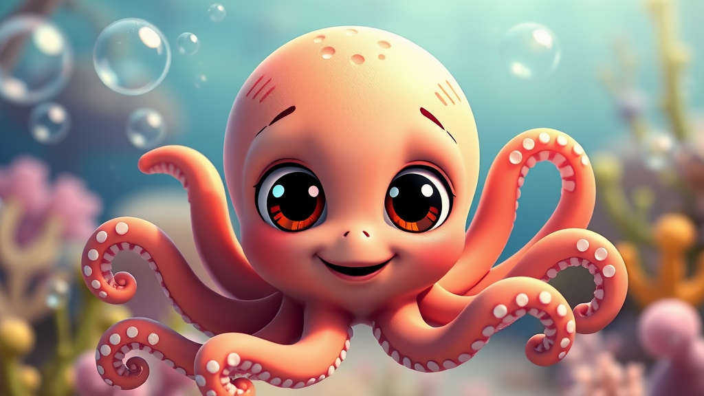 Adorable baby octopus with oversized eyes and a playful expression, rendered in vibrant colors with a Pixar-like animation style, surrounded by bubbles and a whimsical underwater world, emphasizing cuteness and charm with smooth textures and soft lighting.