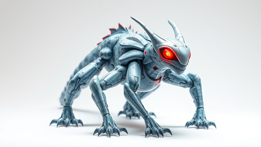Full-body creature with glowing ruby red eyes, set against a simple white background. The design features a luxurious blend of majestic light blue granite and opulent marble textures, showcasing a quadrupedal creature with a sleek, sci-fi inspired aesthetic. The stylized 3D form is enhanced with chromatic aberration, giving it a unique and vibrant appearance. The creature exudes an aura that is both powerful and elegant. Its features are clear and well-defined, ensuring no anatomical inaccuracies or unrealistic elements. The composition is centered and well-crafted, emphasizing the beauty and uniqueness of this solitary figure.